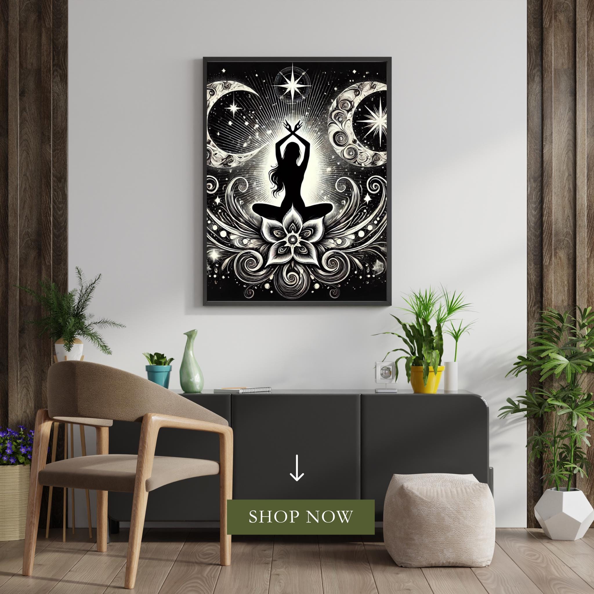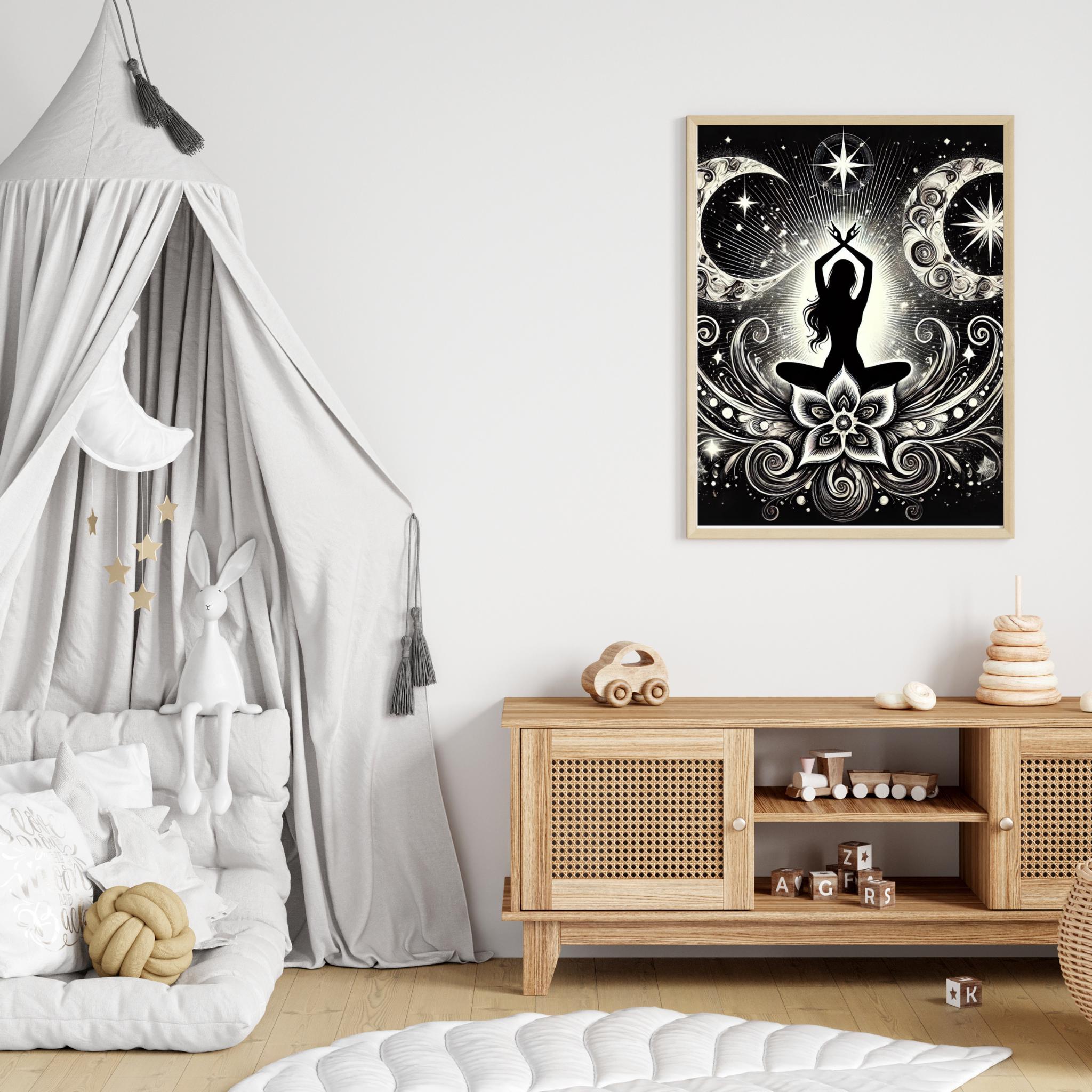 Surround yourself with the peaceful energy of this spiritual decor piece, blending soft celestial hues with an ethereal atmosphere. Whether used for mindfulness poster inspiration or as a symbolic representation of calm, this design encourages a deep connection to stillness.