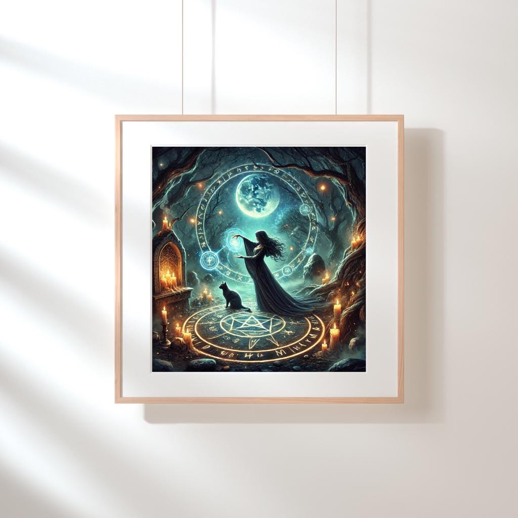 "Embrace the mystical energy of the night with Mystic Moon Ritual - Witchcraft Wall Art | Celestial Printable | Digital Download. This stunning mystic moon art piece captures the essence of lunar magic, witchcraft, and celestial energy. Perfect for creating an enchanted atmosphere in your home, altar, or sacred space."
