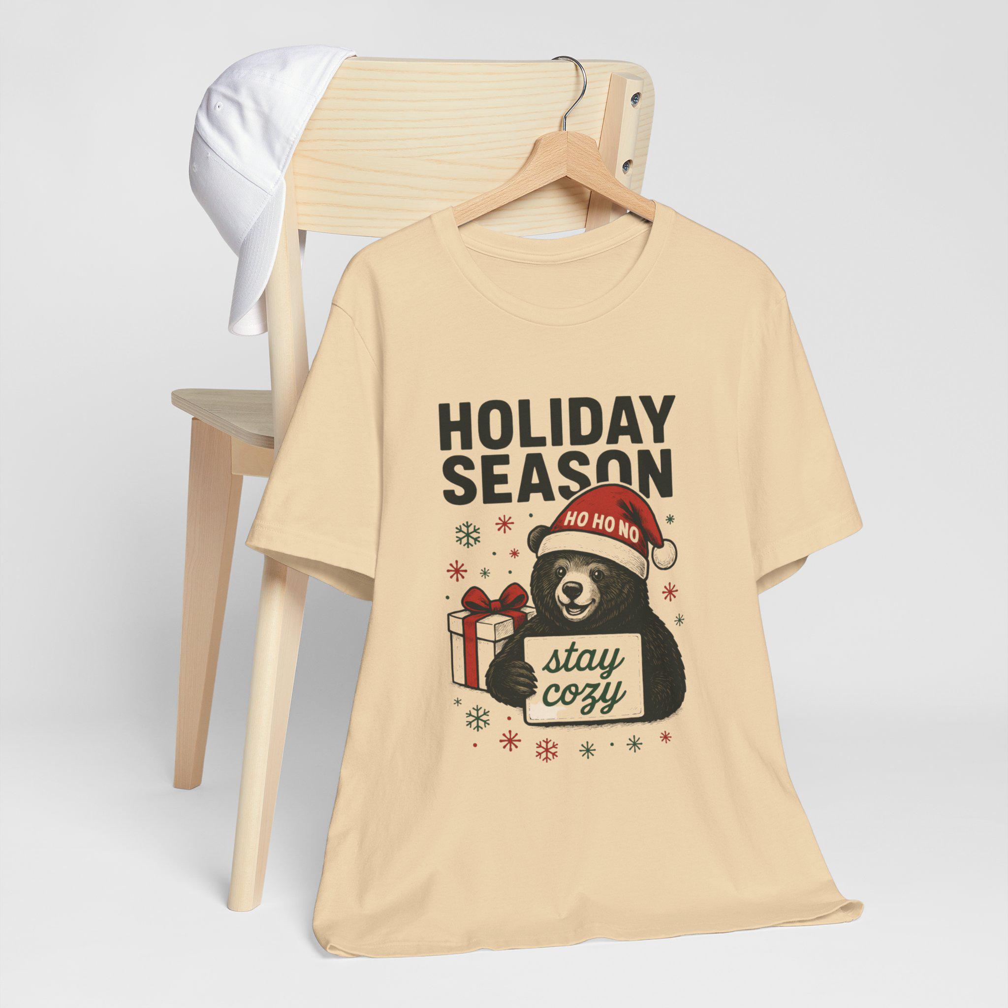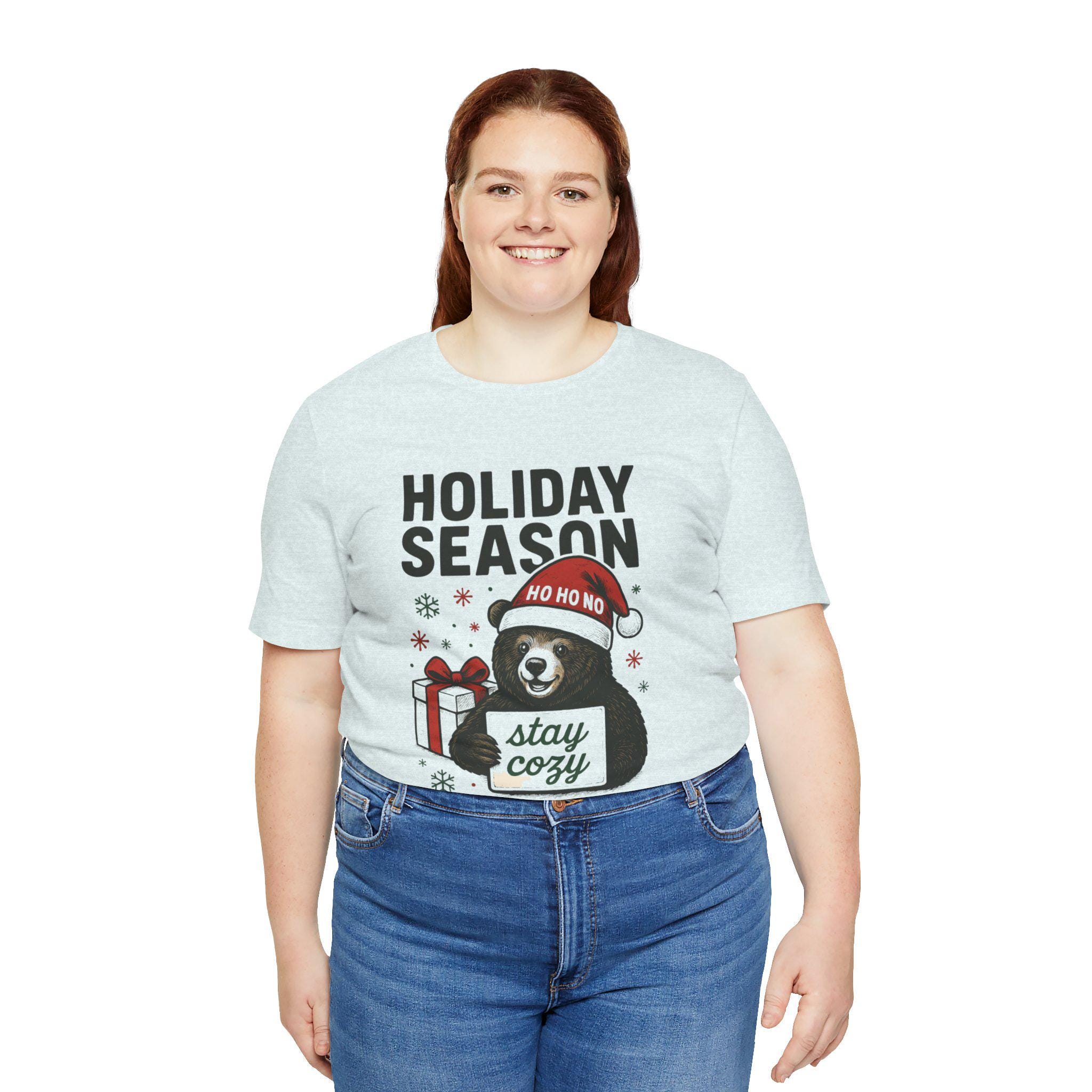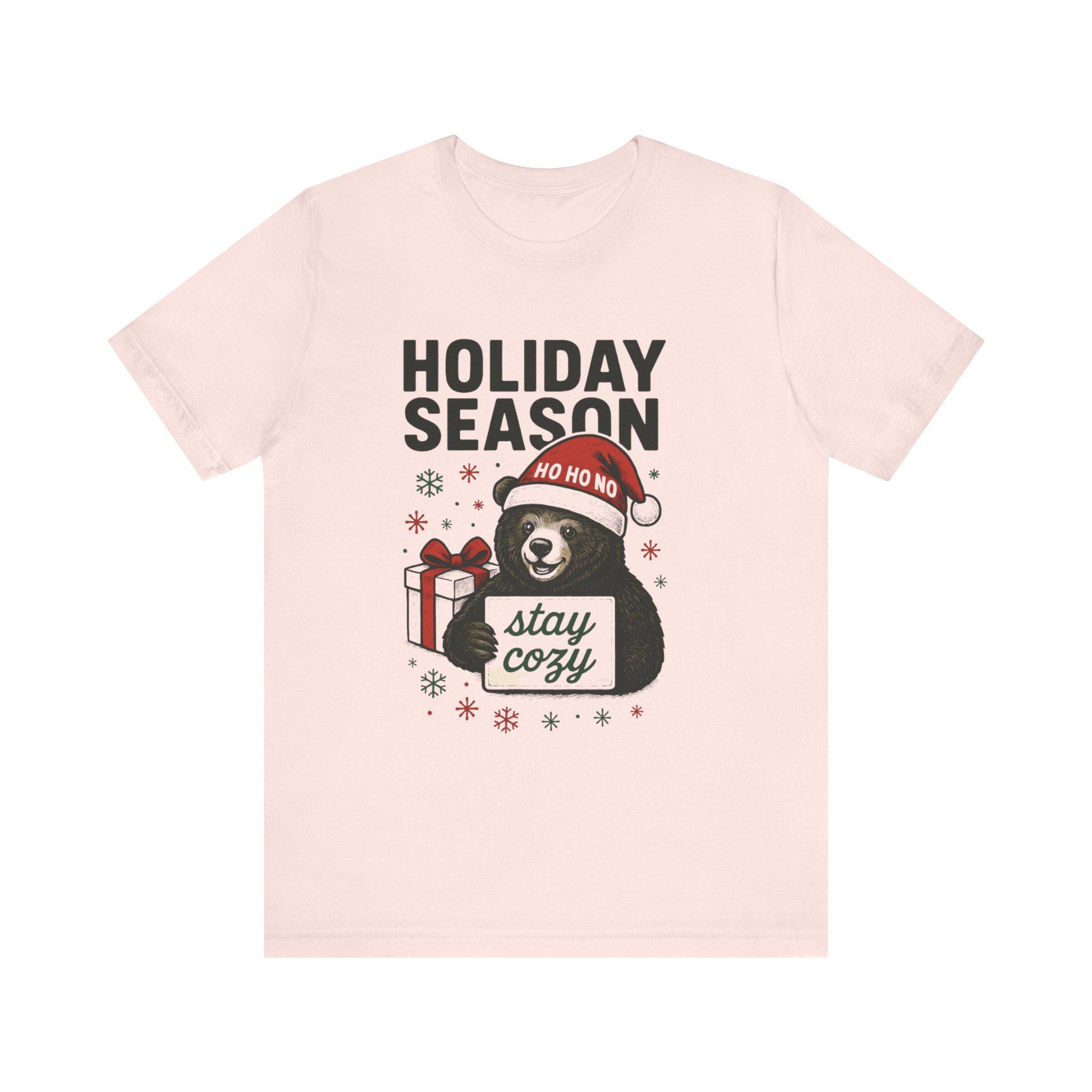 Get ready for the festive season with this cozy Unisex Jersey Short Sleeve Tee. Featuring a delightful bear in a Santa hat, this shirt embodies a fun and cheerful vibe, perfect for celebrating the holidays. It's not just a tee; it's a statement piece for family gatherings, parties, or cozy nights in. Ideal for anyone looking to spread joy during Christmas, New Year's, or any holiday celebration. Wear it with jeans or layer it for a chic, laid-back look. This tee is perfect for individuals who prioritize comfort and style while enjoying their holiday festivities.