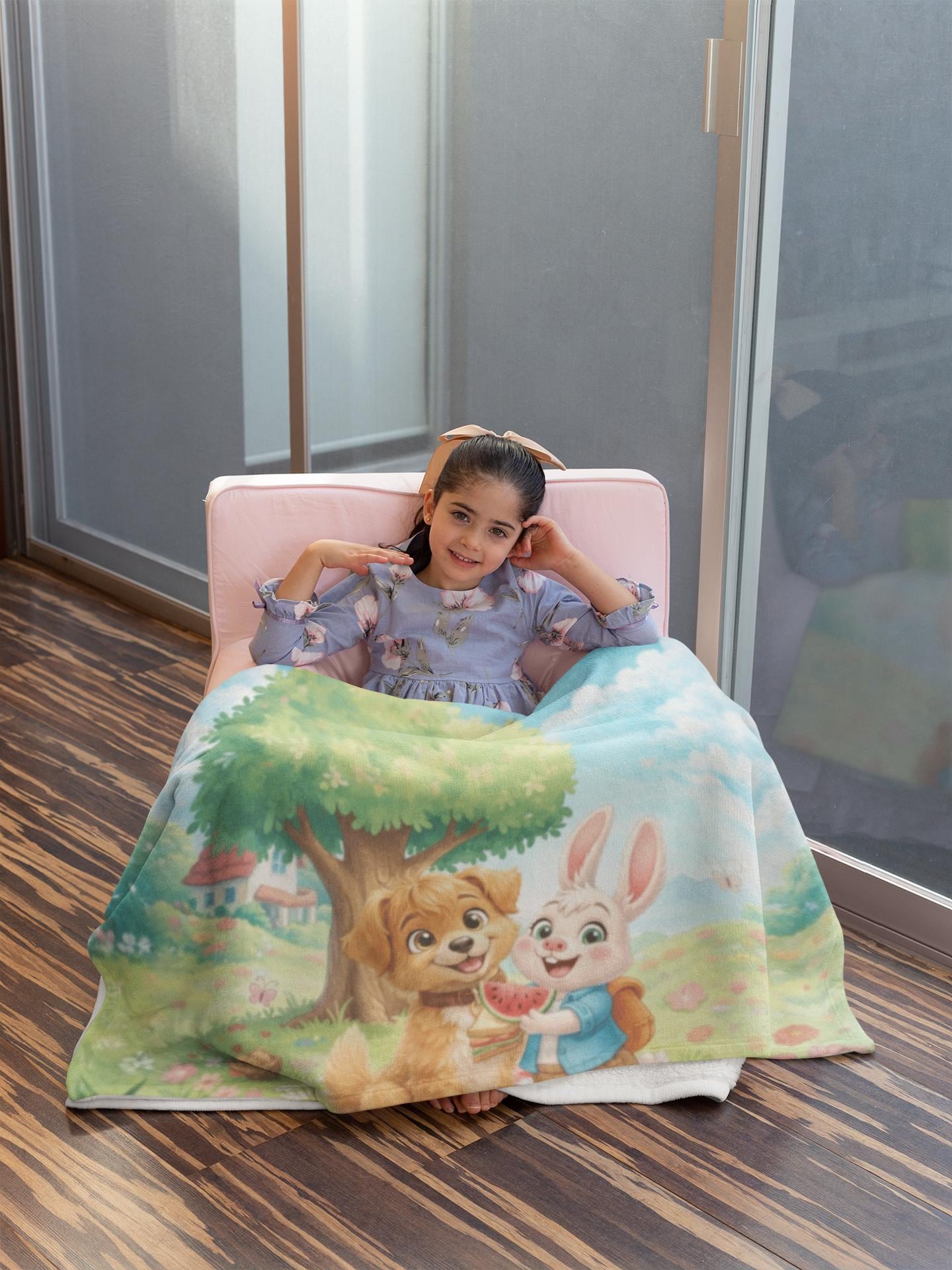A soft, snuggly velveteen blanket printed with a bright, storybook scene of a puppy and bunny sharing a picnic under a big oak. The image appears in vivid, high-detail color on one side, framed by a clean white border. Lightweight yet cozy, the fabric drapes easily over laps or little shoulders and holds its shape wash after wash. This blanket brings a calm, playful moment to bedtime, reading nooks, or quiet afternoons on the couch — a gentle companion that sparks imagination and comfort.