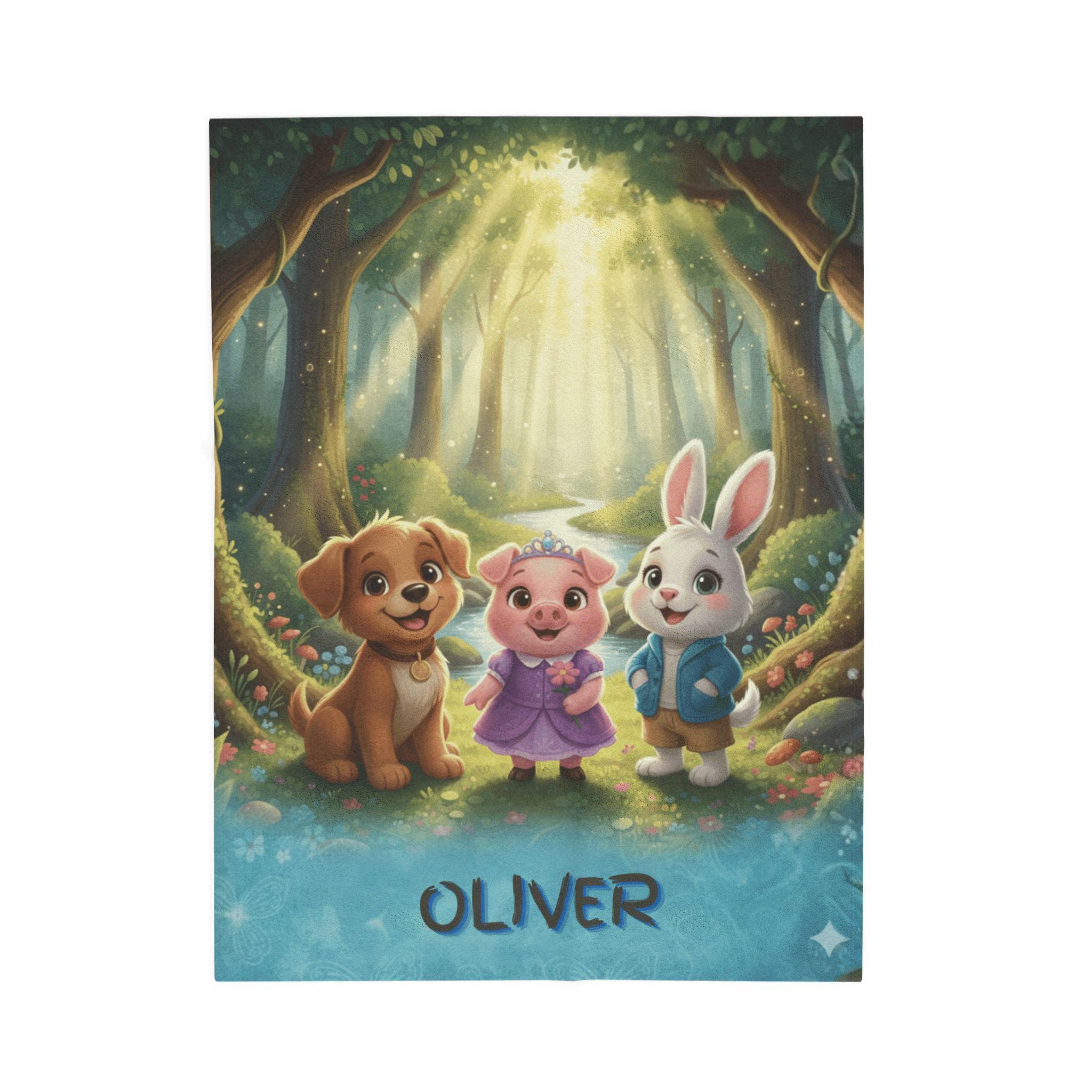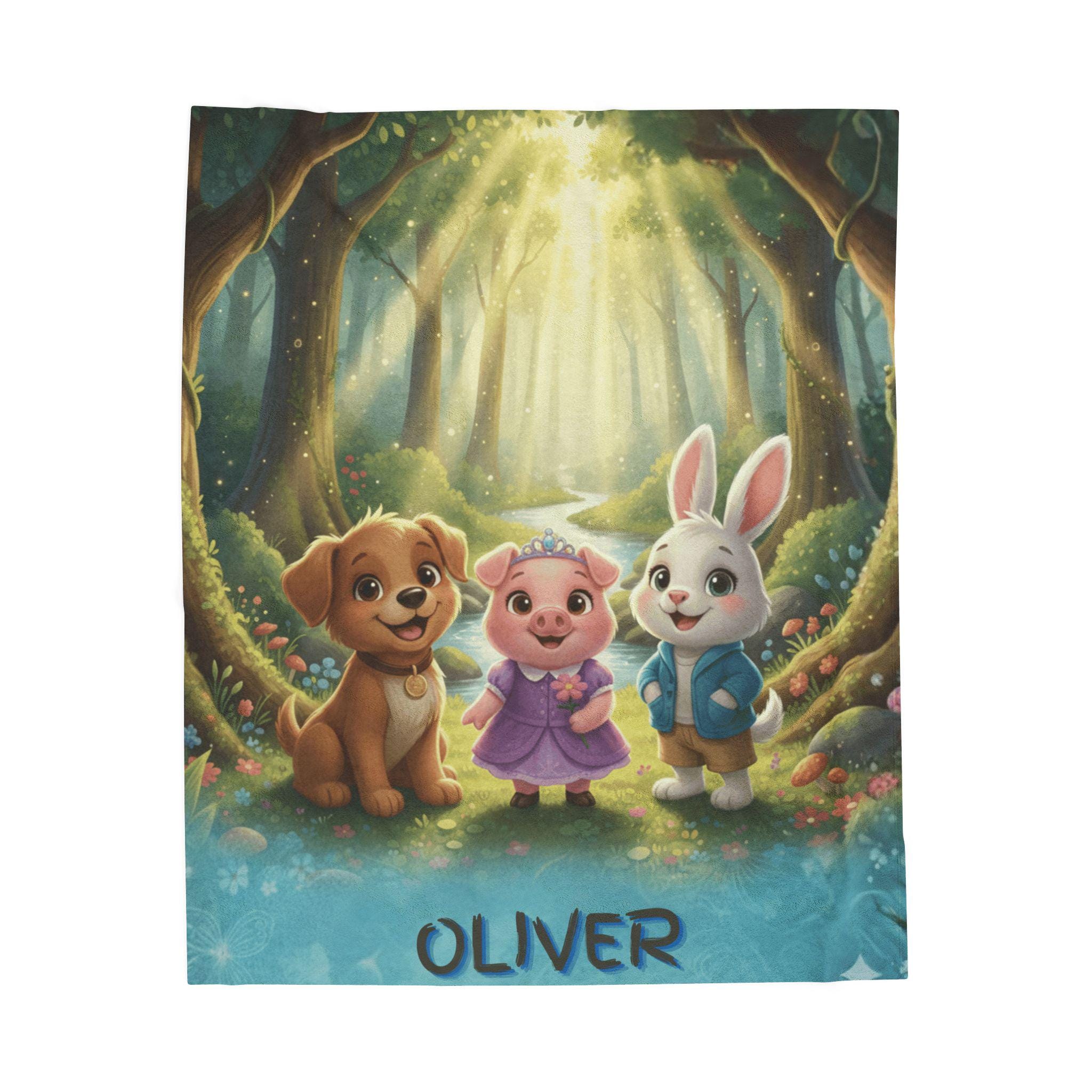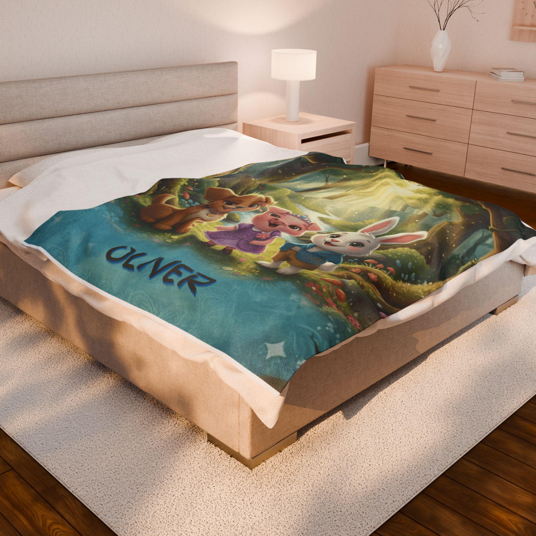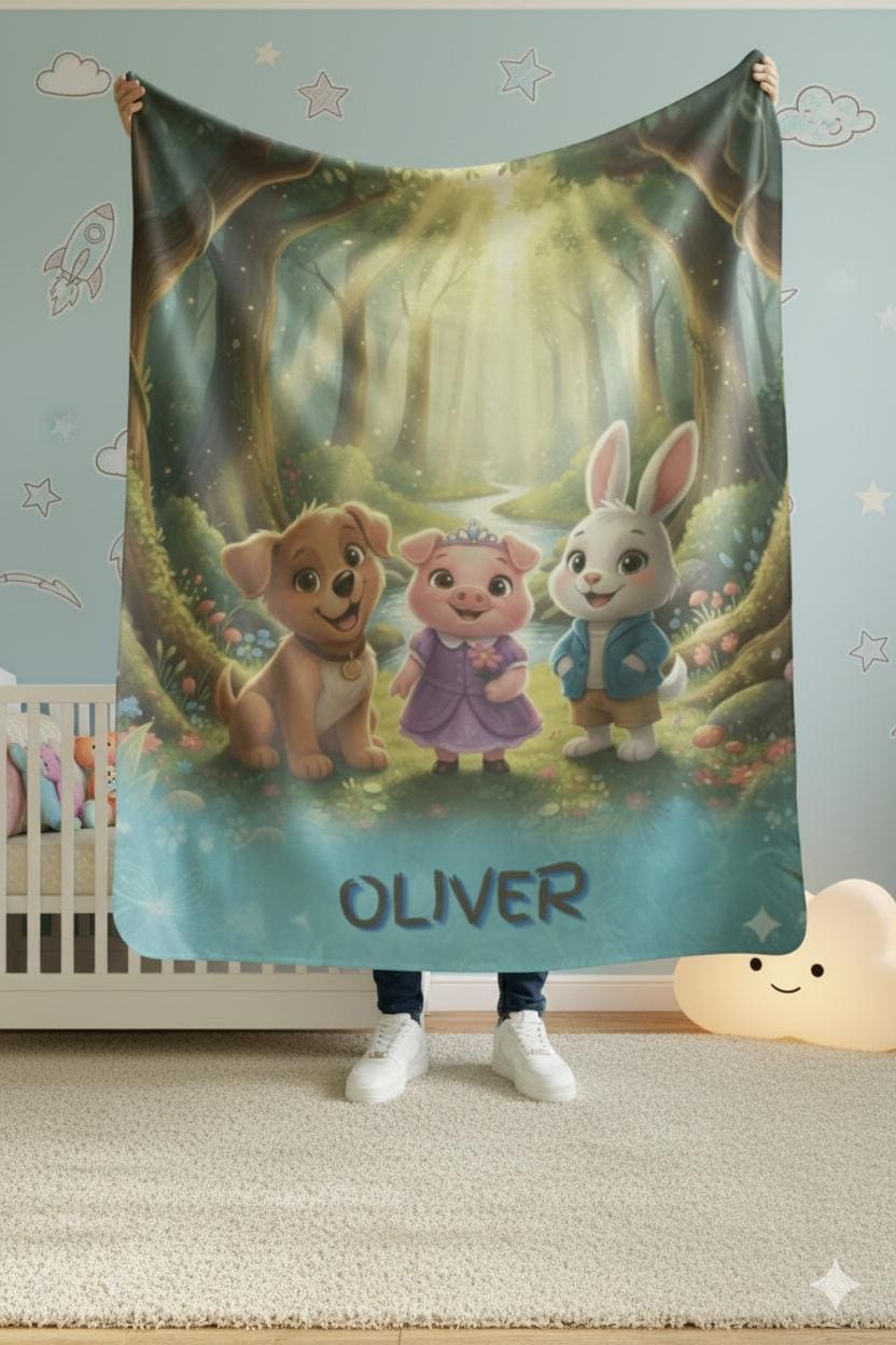 A velveteen plush blanket that turns everyday rest into a cozy adventure. This soft, medium-weight throw showcases a vivid, high-detail scene of friendly woodland companions glowing under a magical forest canopy, bringing warmth and imagination to reading time, naps, and movie nights. Durable polyester fabric and careful stitching help preserve the bright colors and silky velveteen feel, wash after wash, while the smooth surface invites little hands to cuddle and relax.