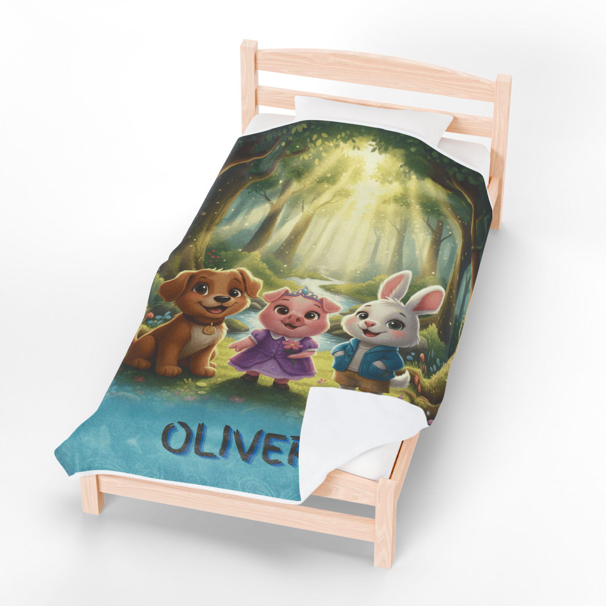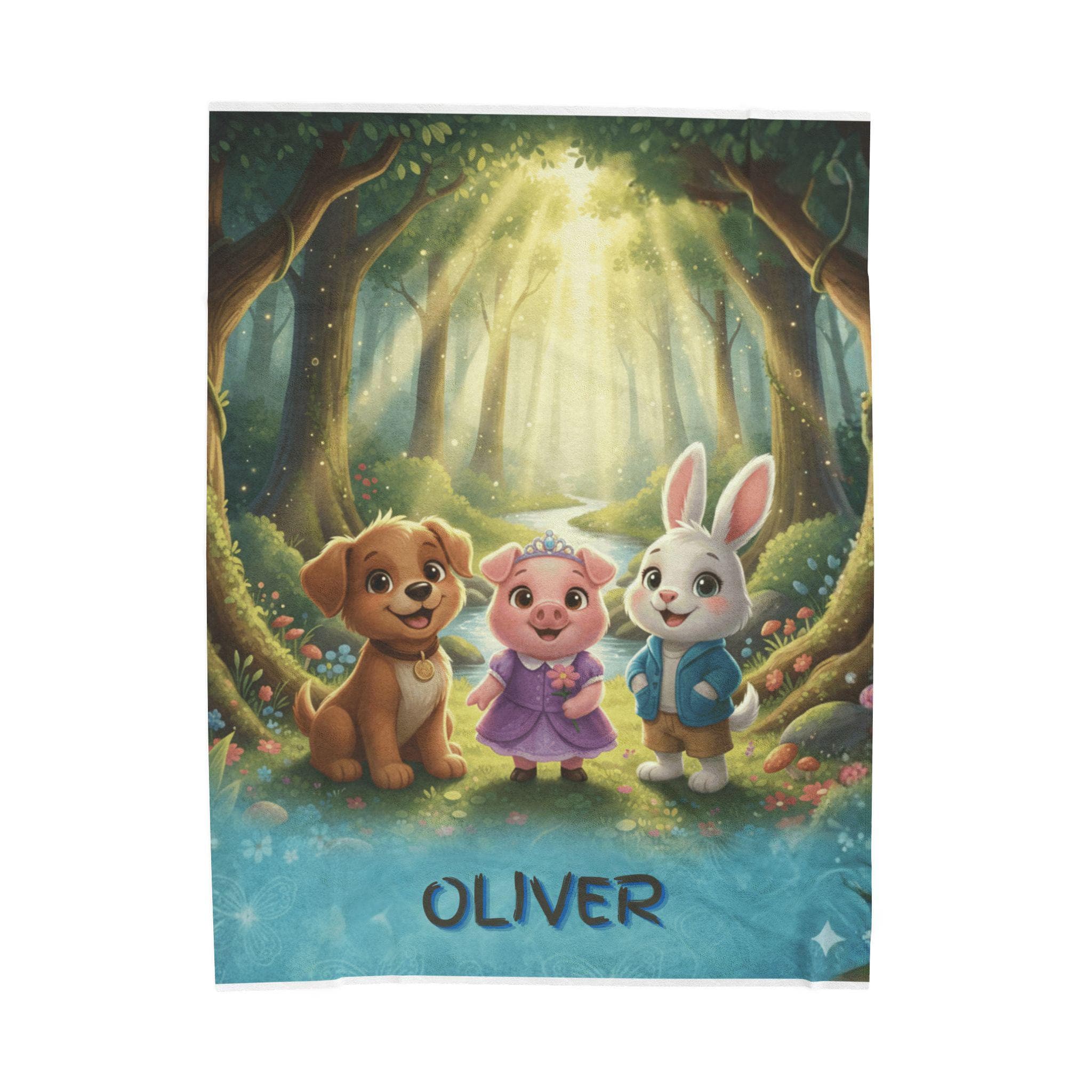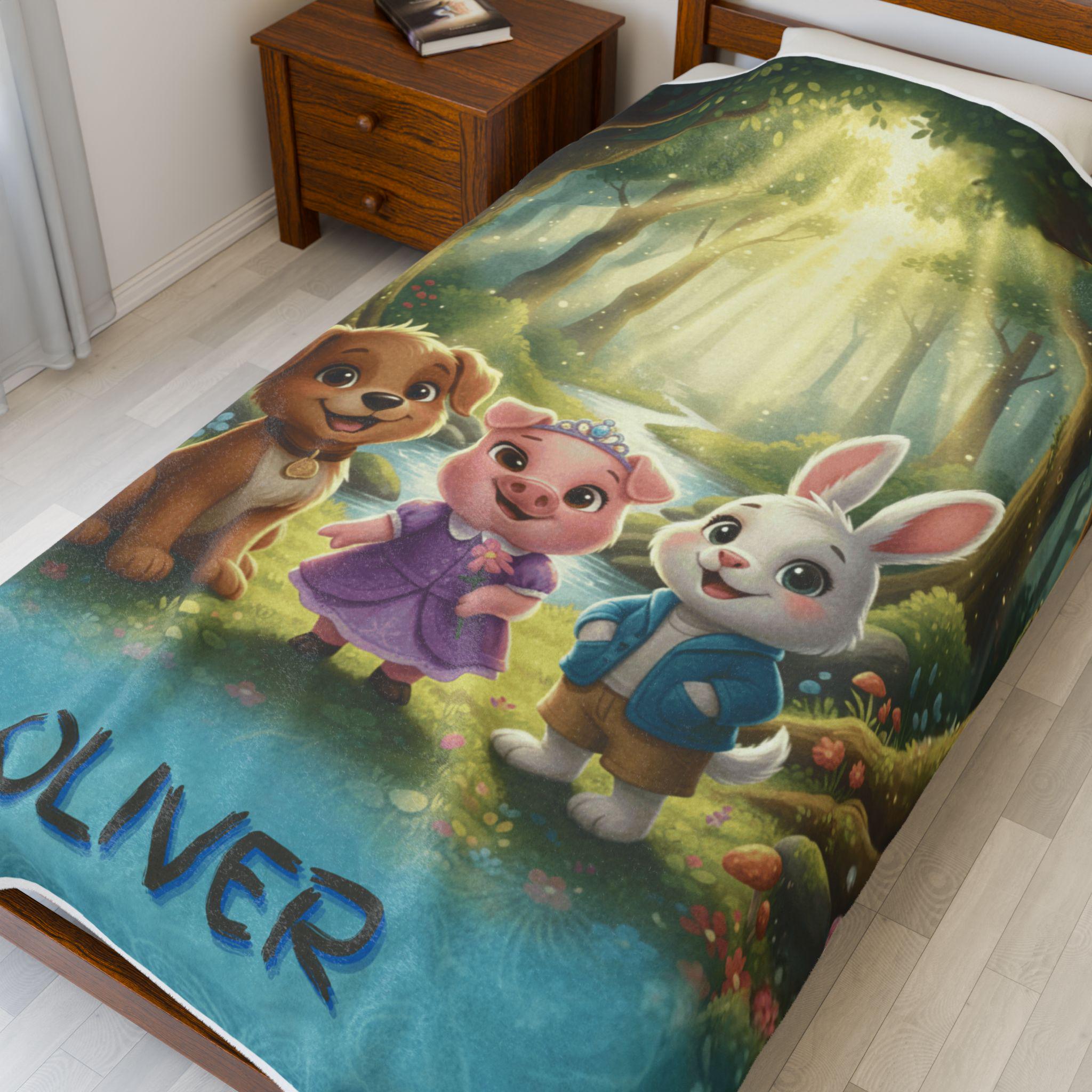 A velveteen plush blanket that turns everyday rest into a cozy adventure. This soft, medium-weight throw showcases a vivid, high-detail scene of friendly woodland companions glowing under a magical forest canopy, bringing warmth and imagination to reading time, naps, and movie nights. Durable polyester fabric and careful stitching help preserve the bright colors and silky velveteen feel, wash after wash, while the smooth surface invites little hands to cuddle and relax.