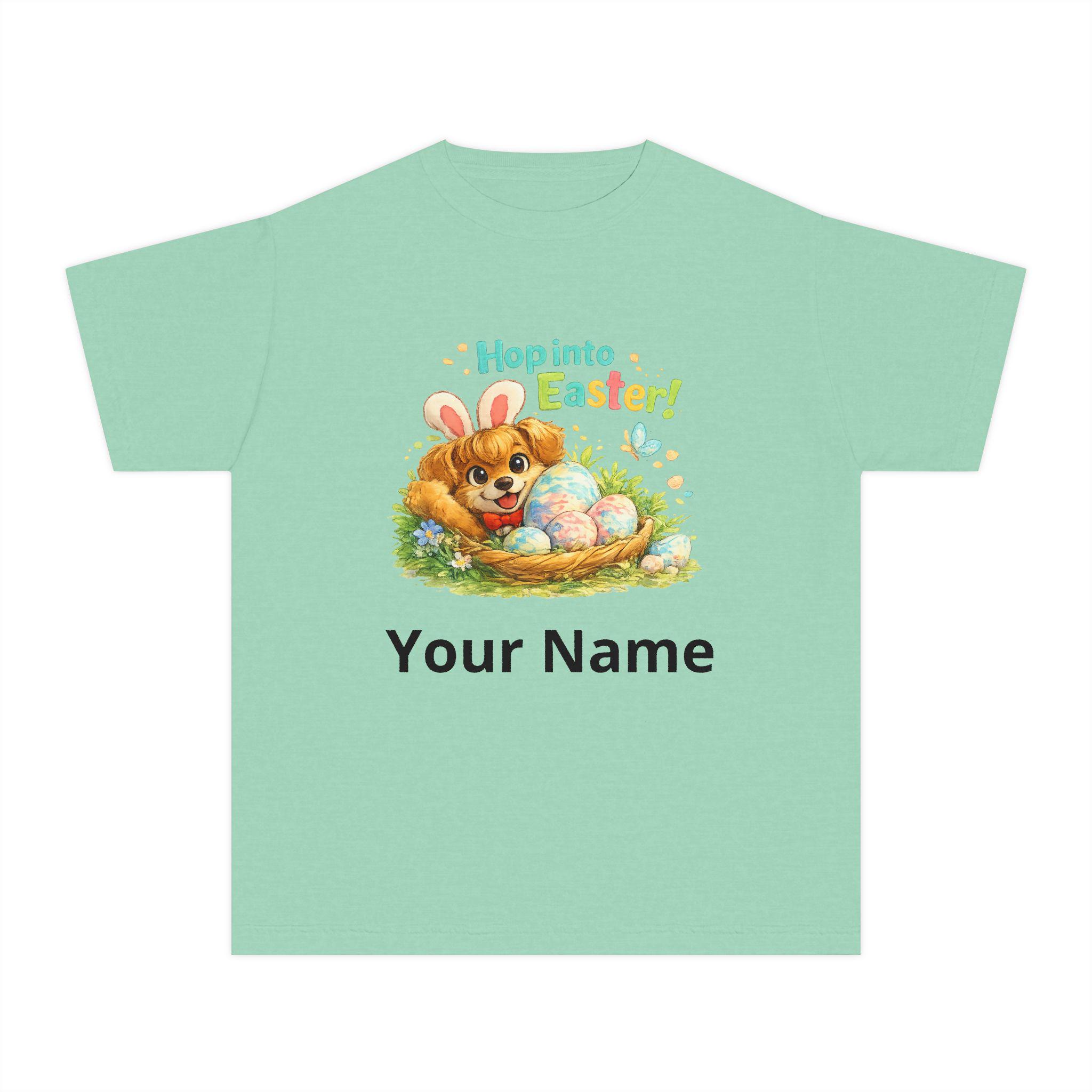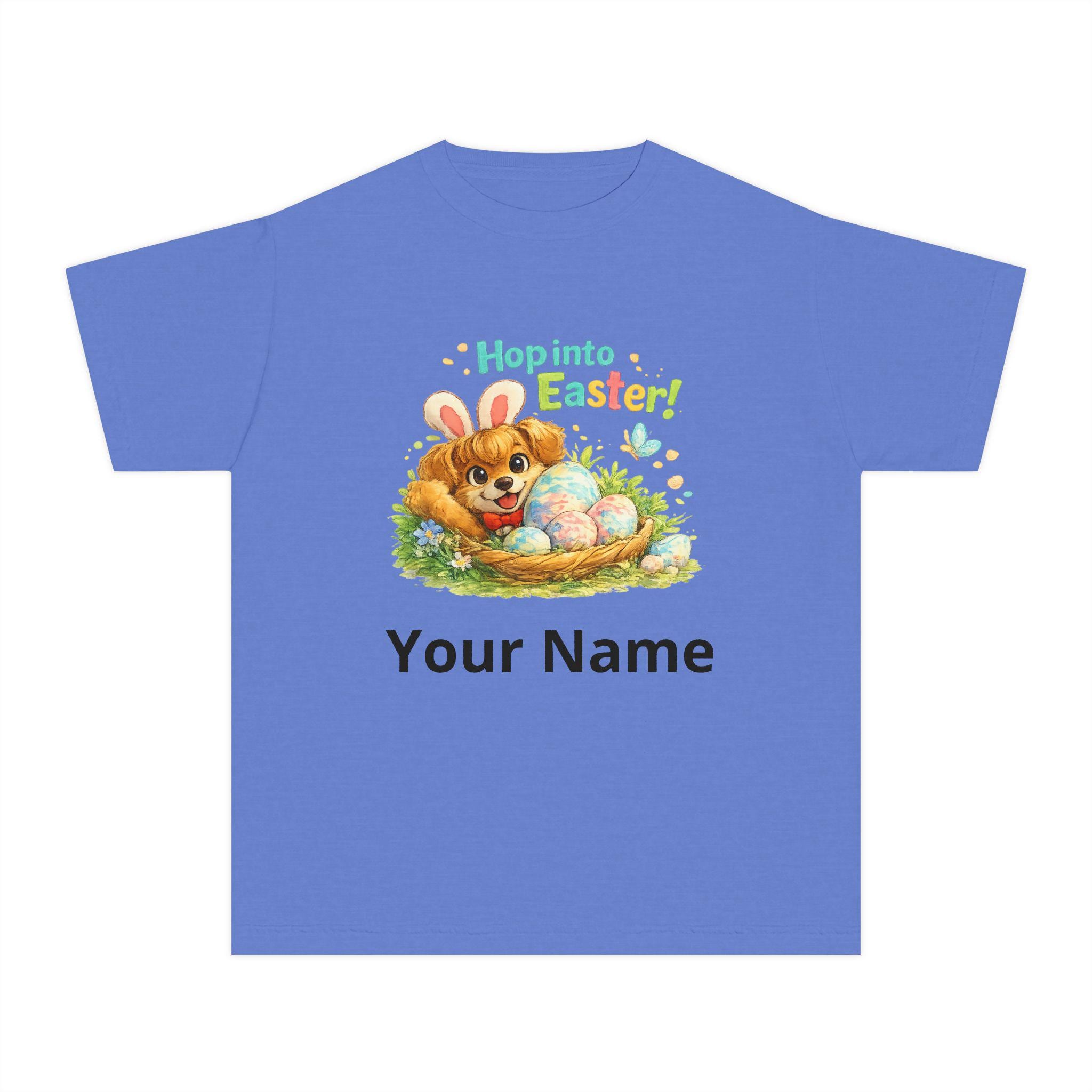 Soft, colorful, and built for play—this midweight youth tee brings the wonder of Easter morning to life. At its heart is a hand-drawn corgi pup, sporting whimsical bunny ears and lounging in a grassy nest filled with pastel-patterned eggs. The cheerful “Hop into Easter!” lettering adds a pop of joy that mirrors a child’s excitement.