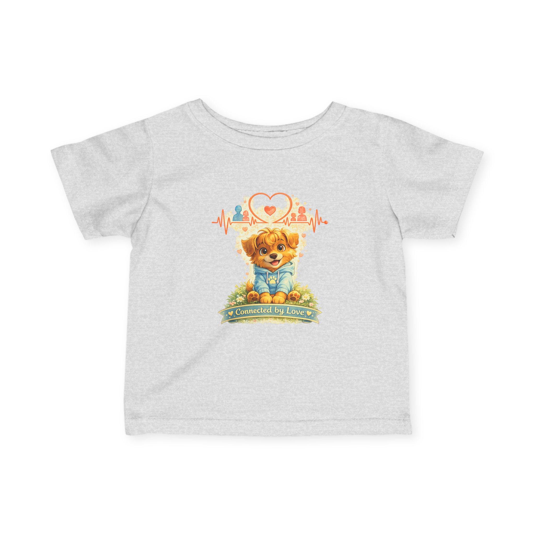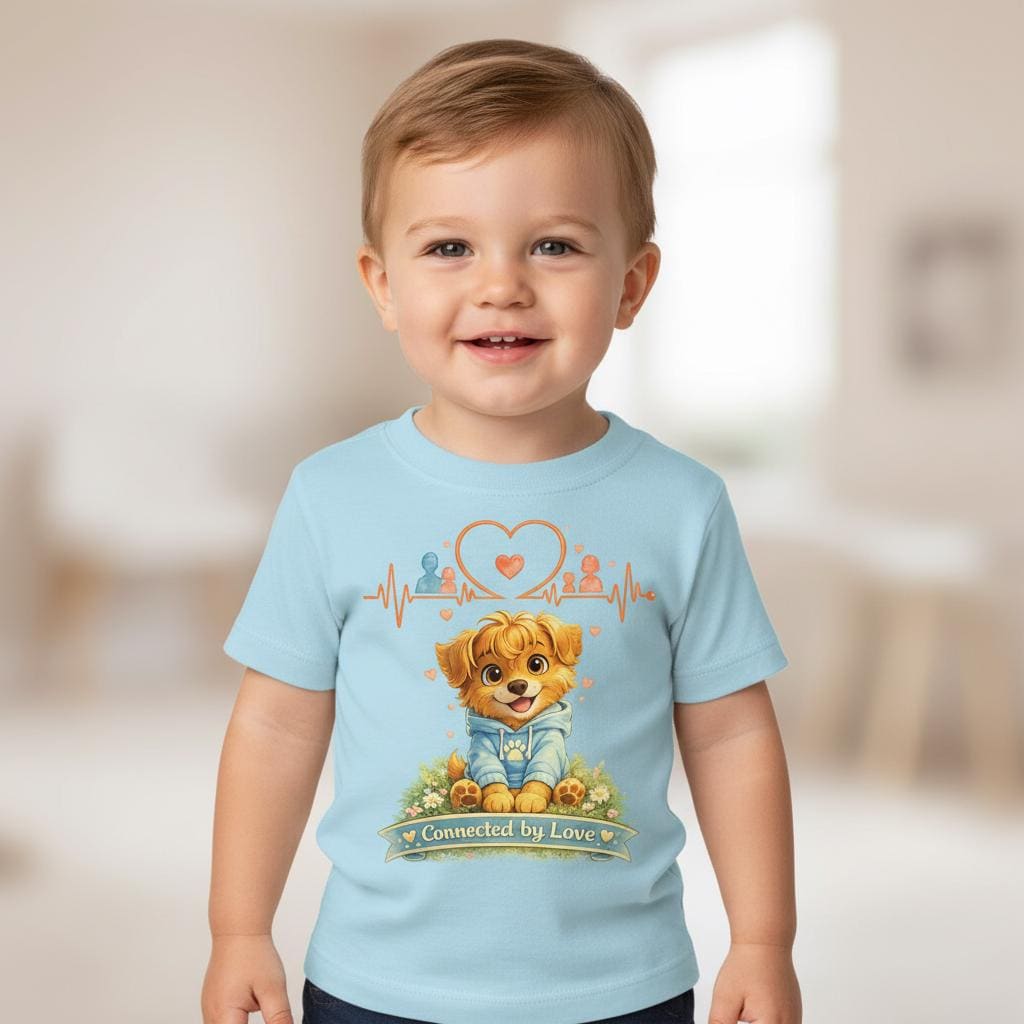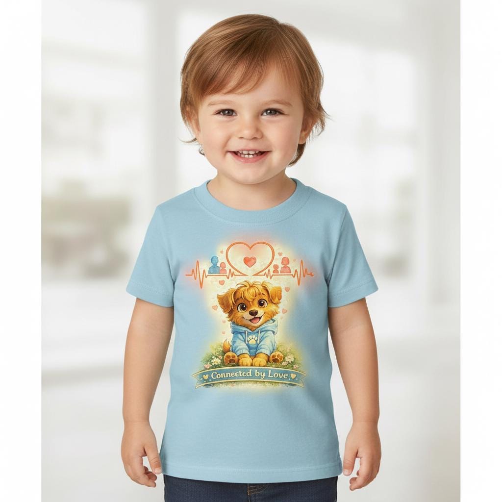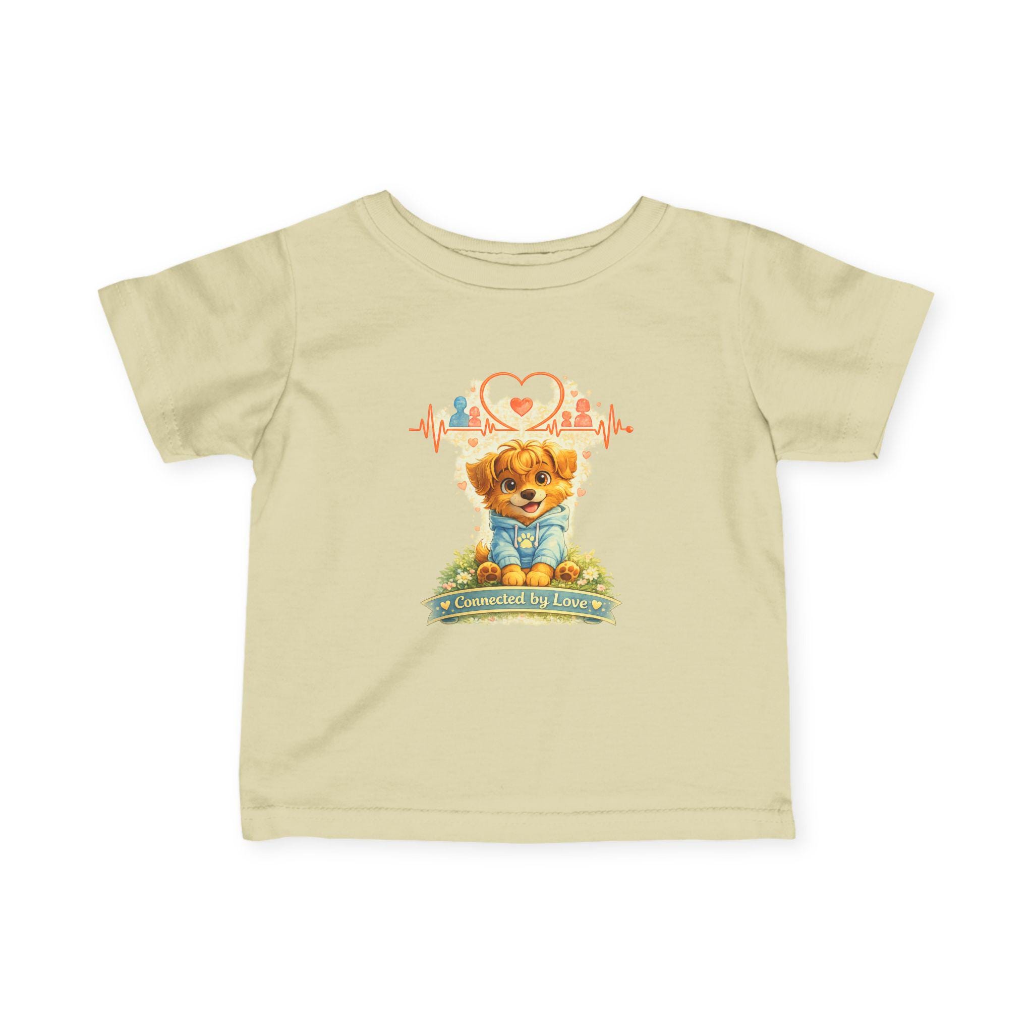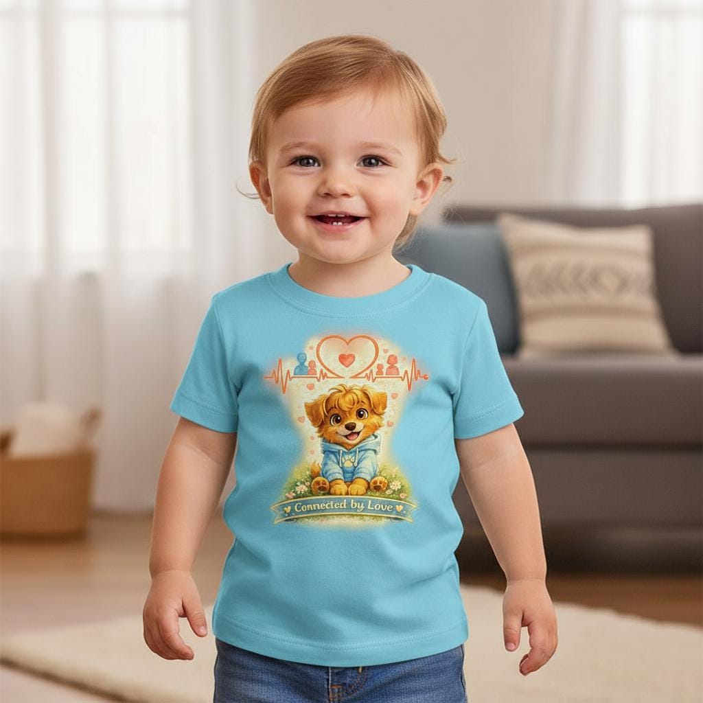 Soft, light, and utterly sweet — this infant tee brings a cozy, handmade feel to everyday cuddles. The center-front illustration shows a smiling puppy framed by a heartbeat and heart motif, with a gentle banner beneath; colors are warm pastels that read like a watercolor story. Short sleeves and a ribbed knit collar make dressing quick and comfortable. Breathable combed cotton keeps tiny skin happy while side seams and shoulder tape help the shirt keep its shape through washes and playtime. It settles into a classic fit that runs true to size, so it layers easily under sweaters or wears alone on mild days.