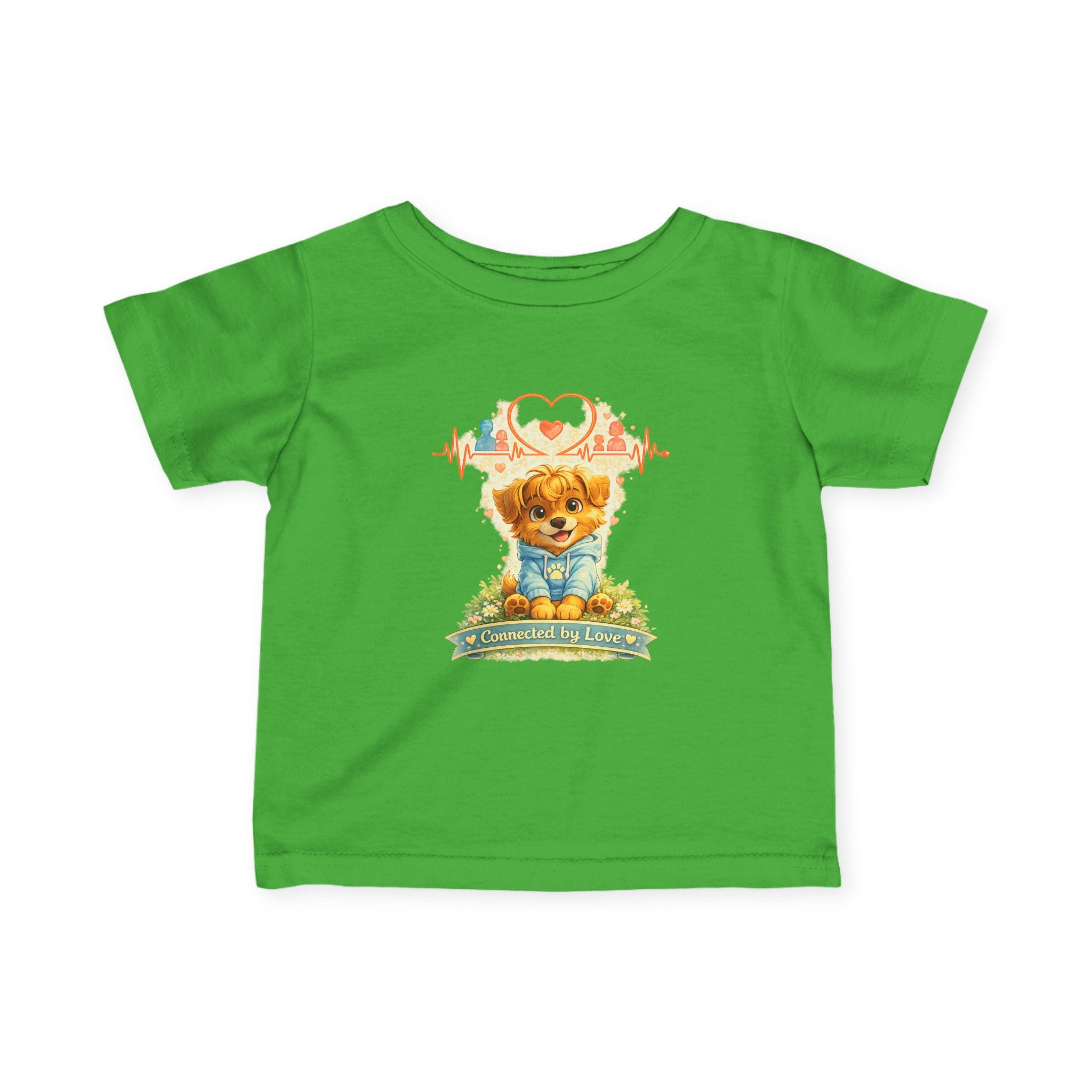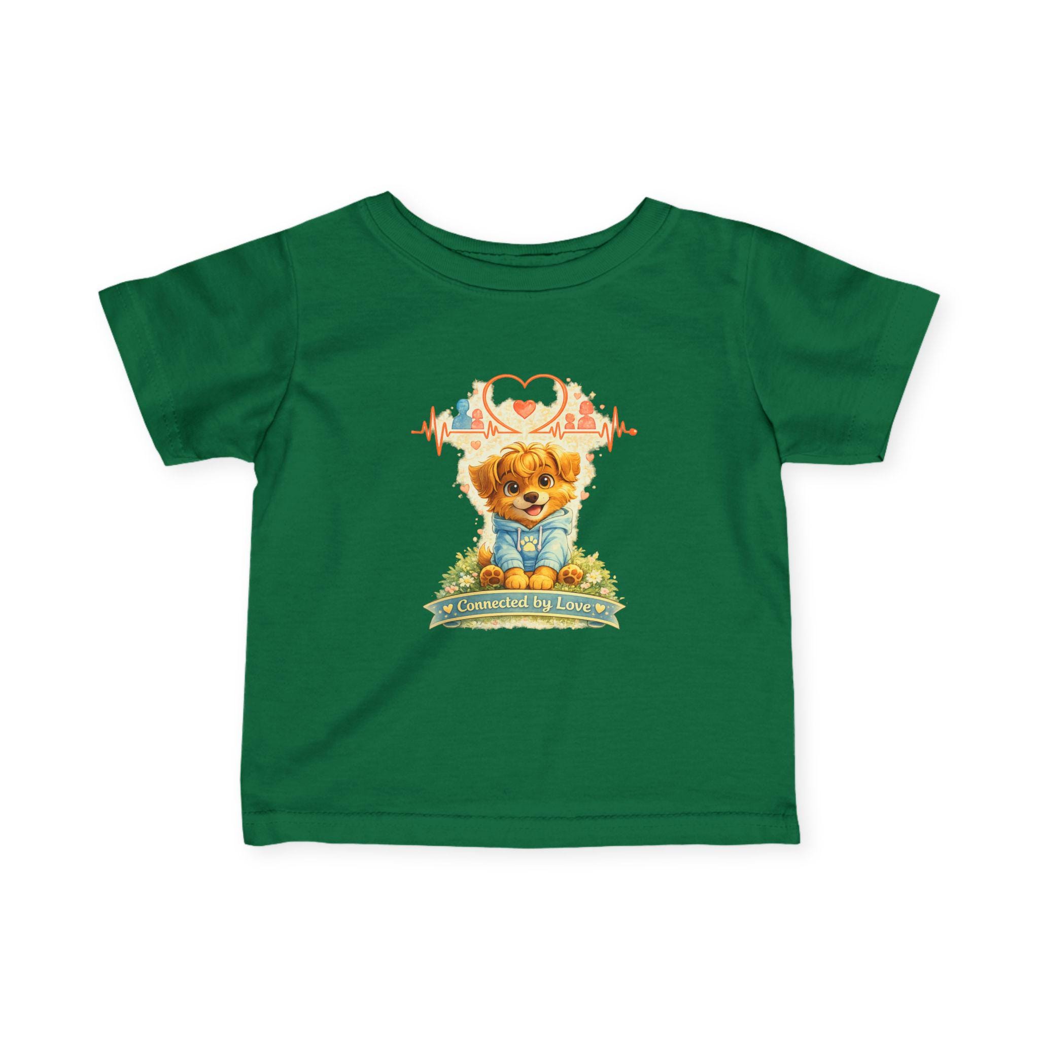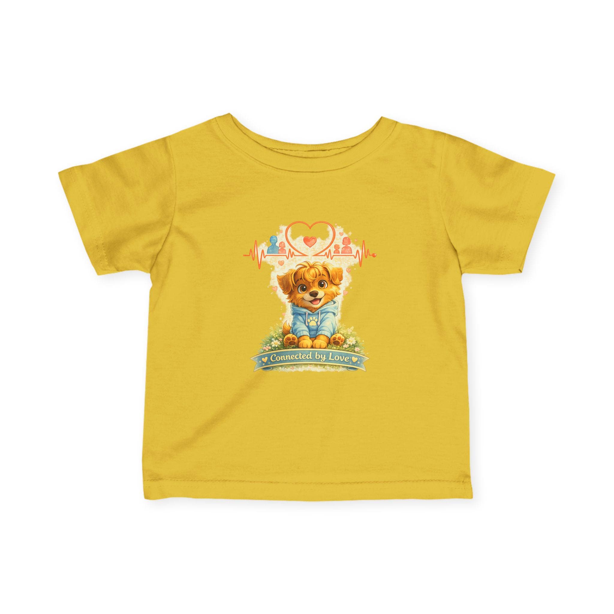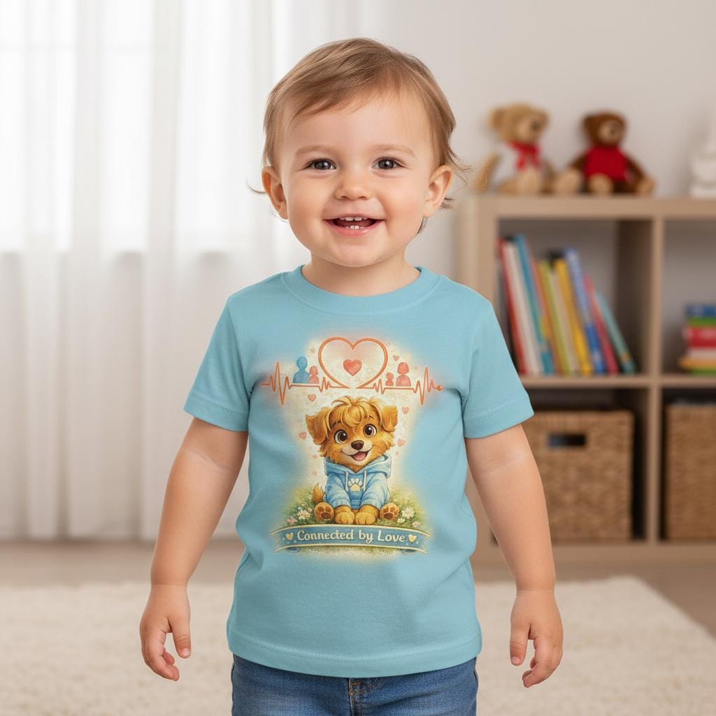Soft, light, and utterly sweet — this infant tee brings a cozy, handmade feel to everyday cuddles. The center-front illustration shows a smiling puppy framed by a heartbeat and heart motif, with a gentle banner beneath; colors are warm pastels that read like a watercolor story. Short sleeves and a ribbed knit collar make dressing quick and comfortable. Breathable combed cotton keeps tiny skin happy while side seams and shoulder tape help the shirt keep its shape through washes and playtime. It settles into a classic fit that runs true to size, so it layers easily under sweaters or wears alone on mild days.