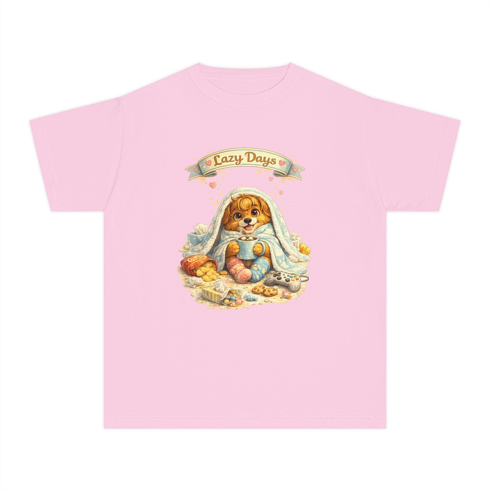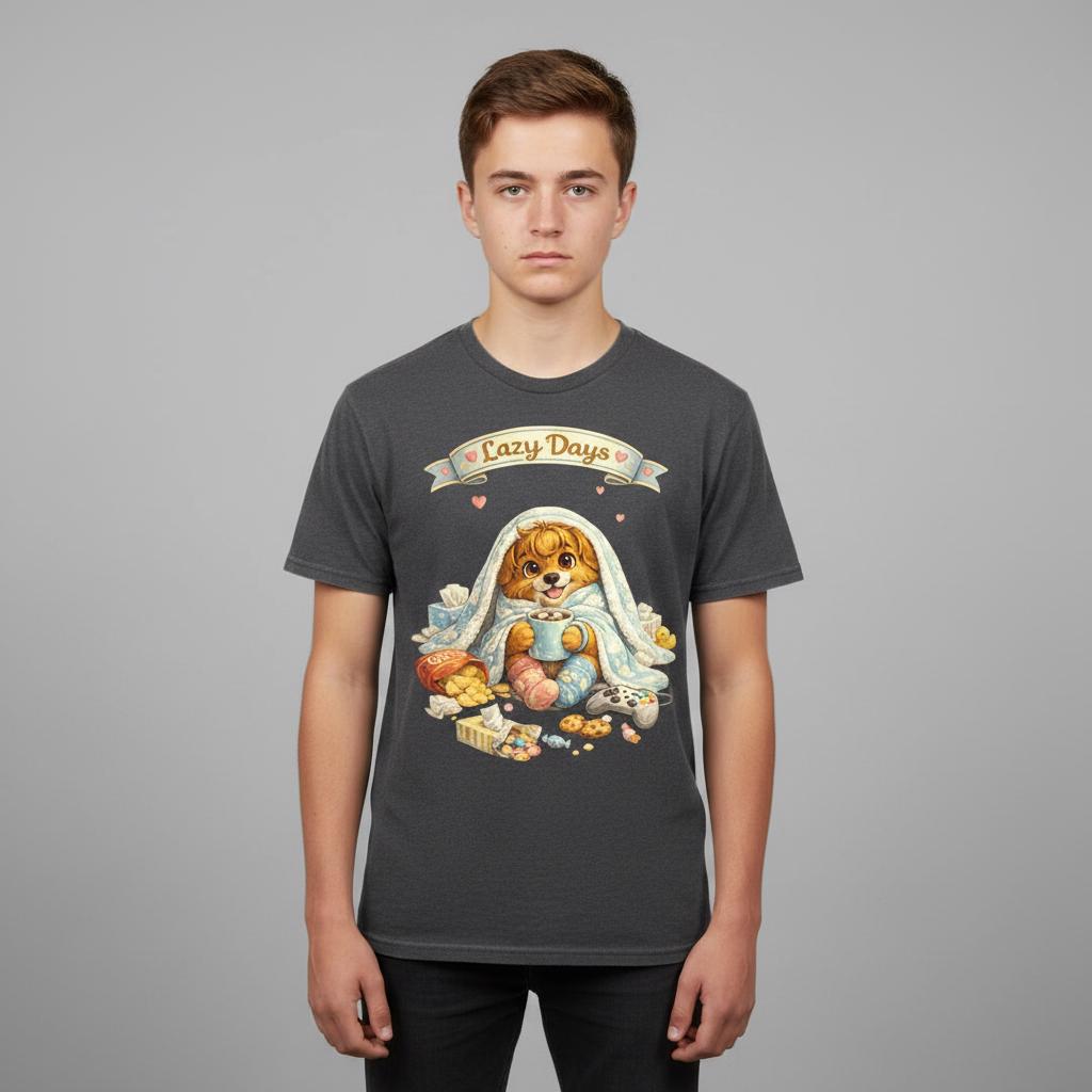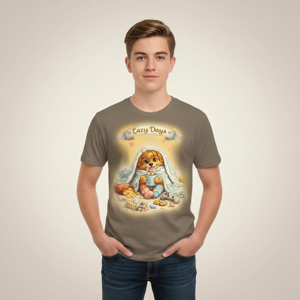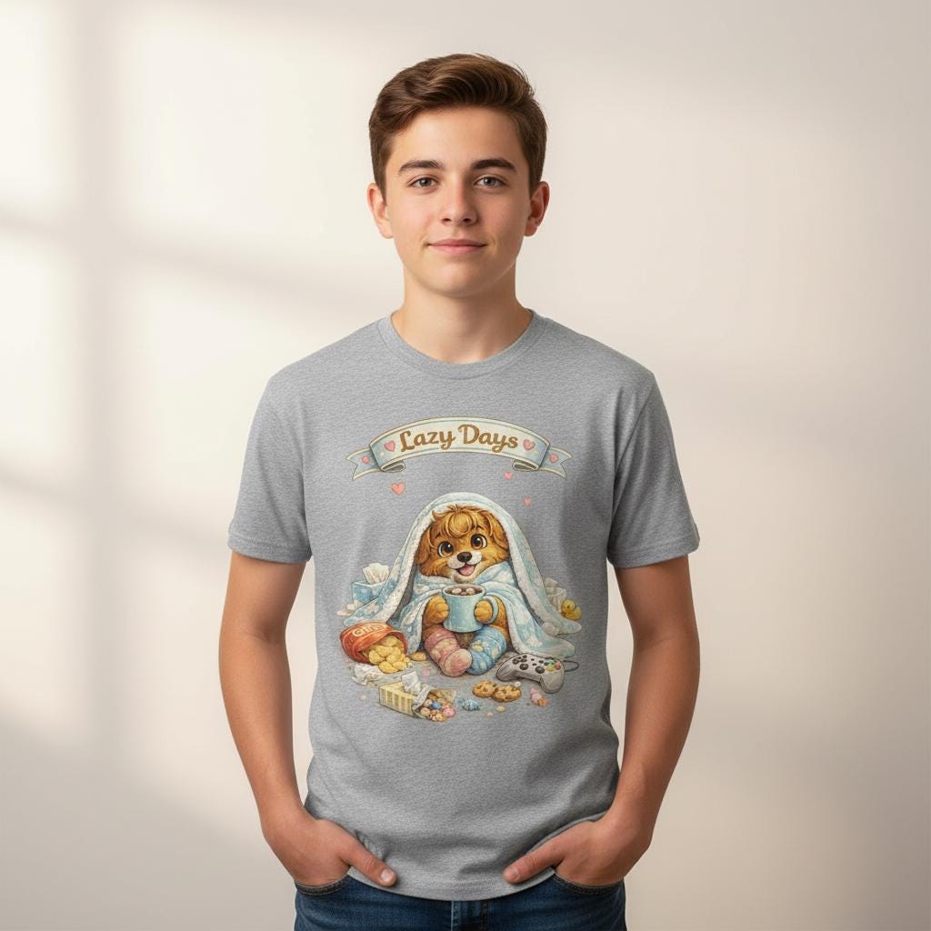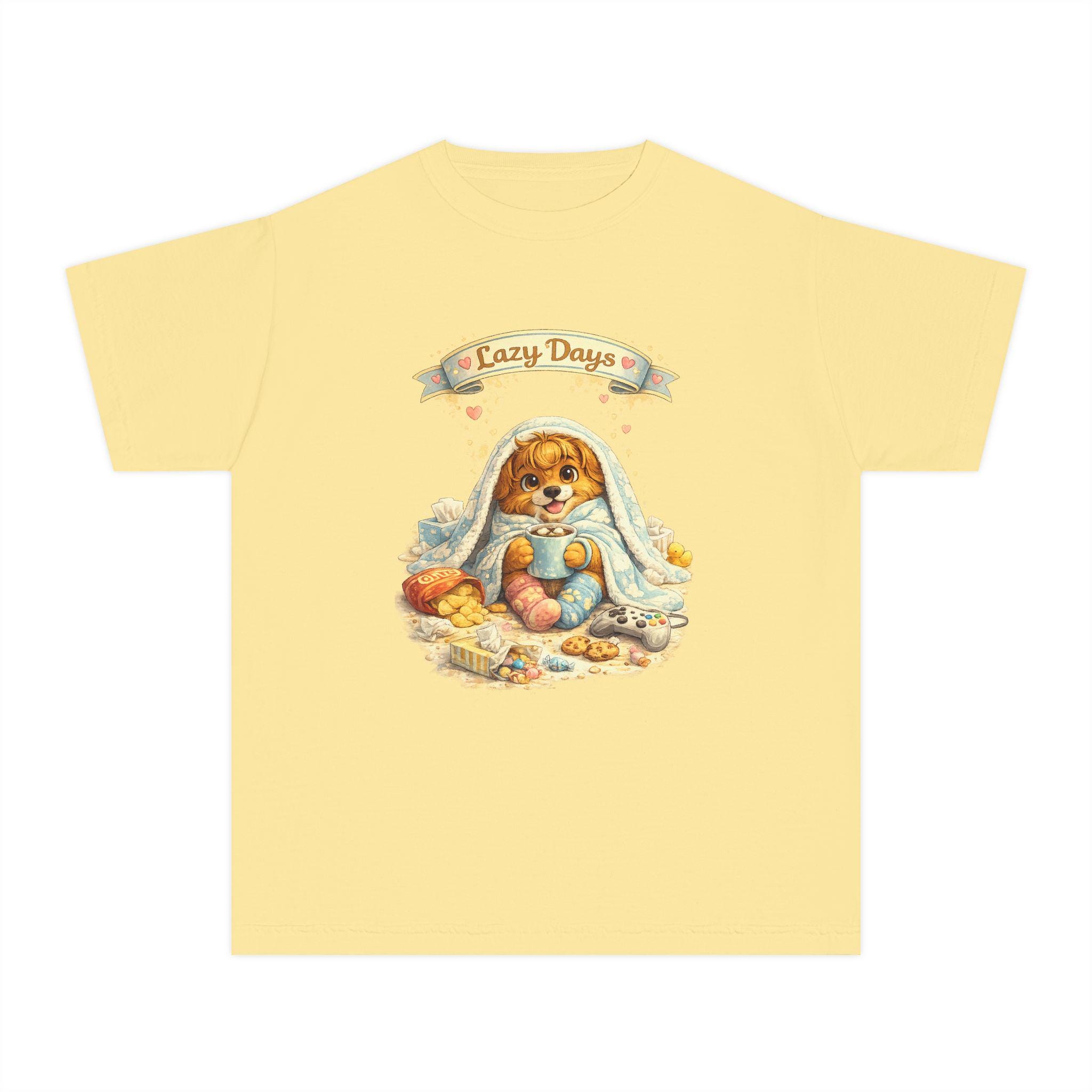 Soft, sunny, and utterly cozy — this youth midweight tee brings a slow-morning vibe to little wardrobes. A gently garment-dyed cotton body carries a warm cream-yellow wash that feels lived-in from day one. The center artwork shows an adorably sleepy puppy tucked under a blanket with plush toys scattered around, and a banner above reading “Lazy Days.” Short, simple sentences capture a relaxed afternoon: cartoons on in the background, a cup of cocoa within reach, and a kiddo drifting between play and nap. The classic fit and medium-weight, combed ring-spun cotton make it comfortable for playtime, quiet story hours, and everything in between. Durable double-needle stitching and twill tape at the neck keep the tee soft but ready for repeat wears and washes — the kind of shirt that becomes a favorite by habit, not hype.