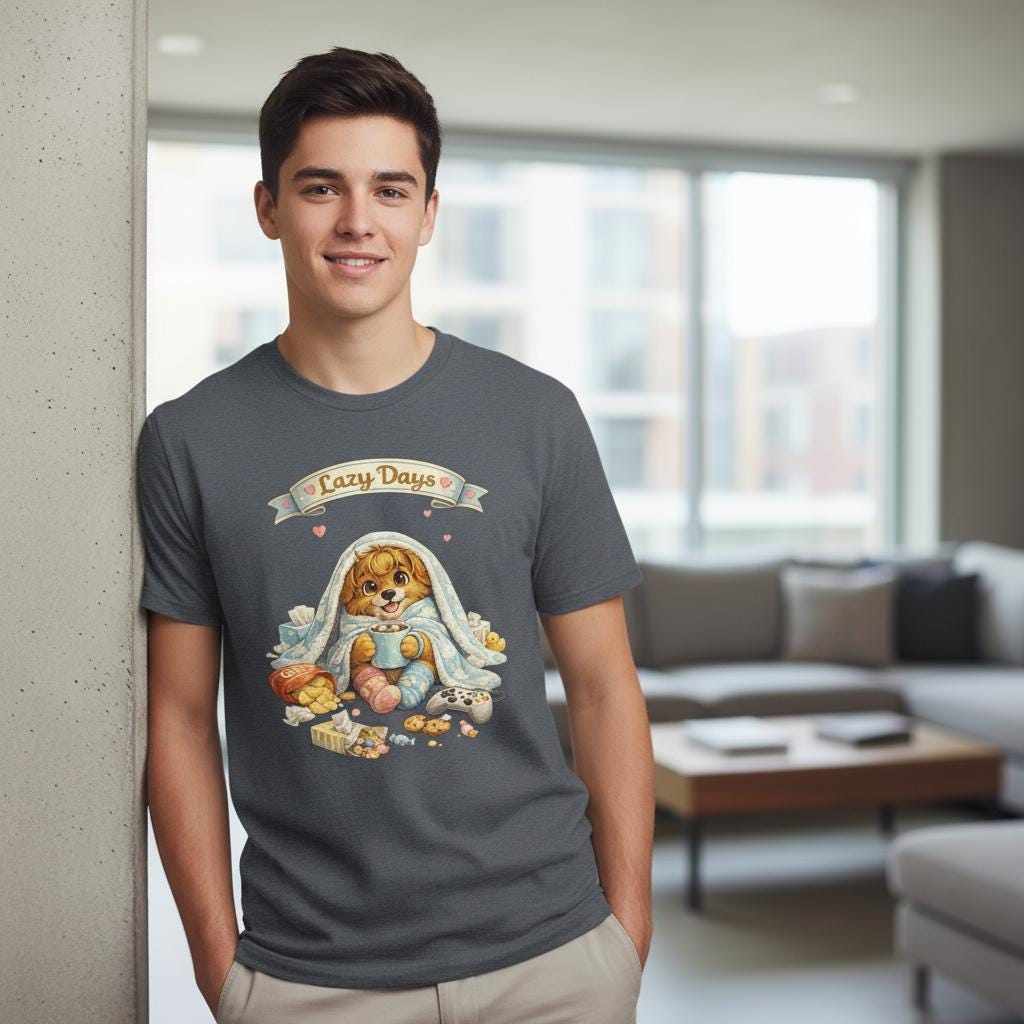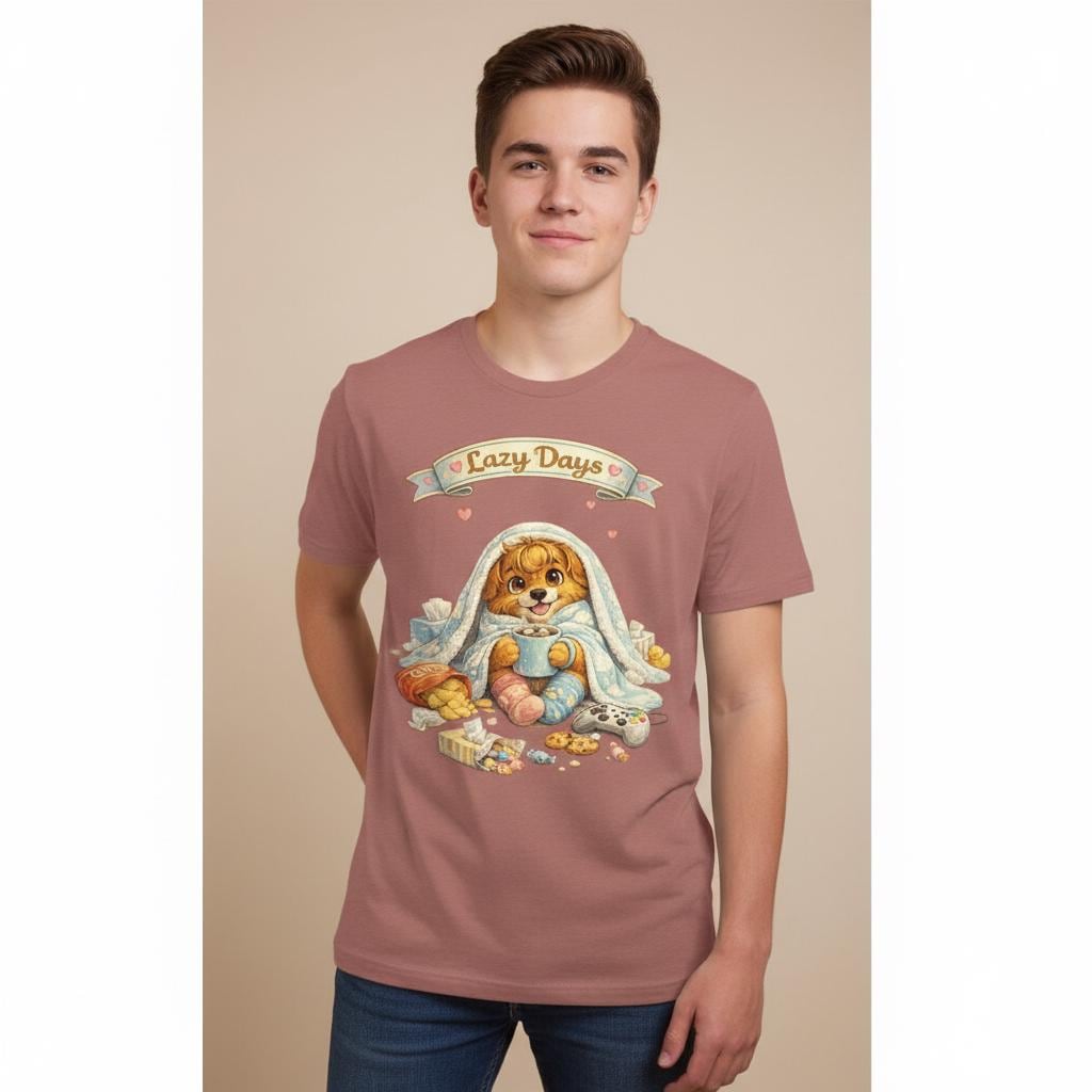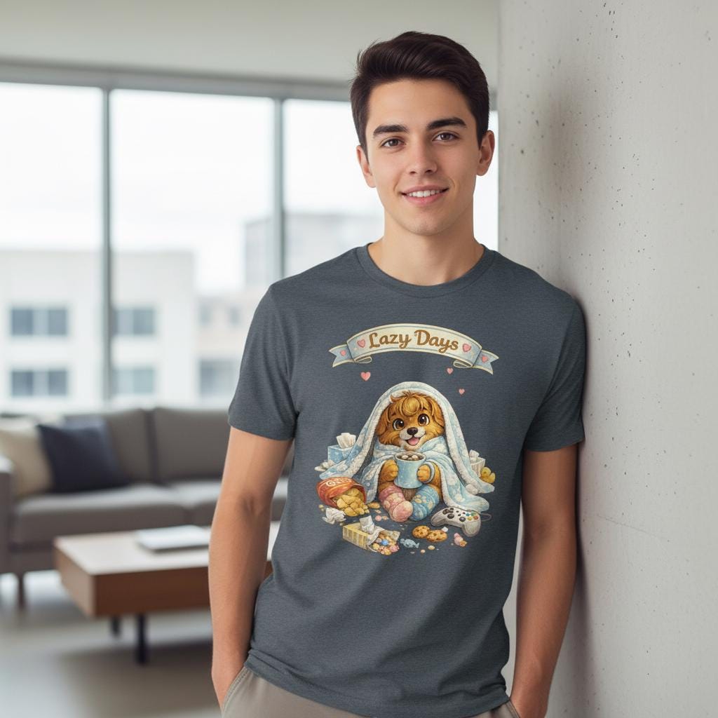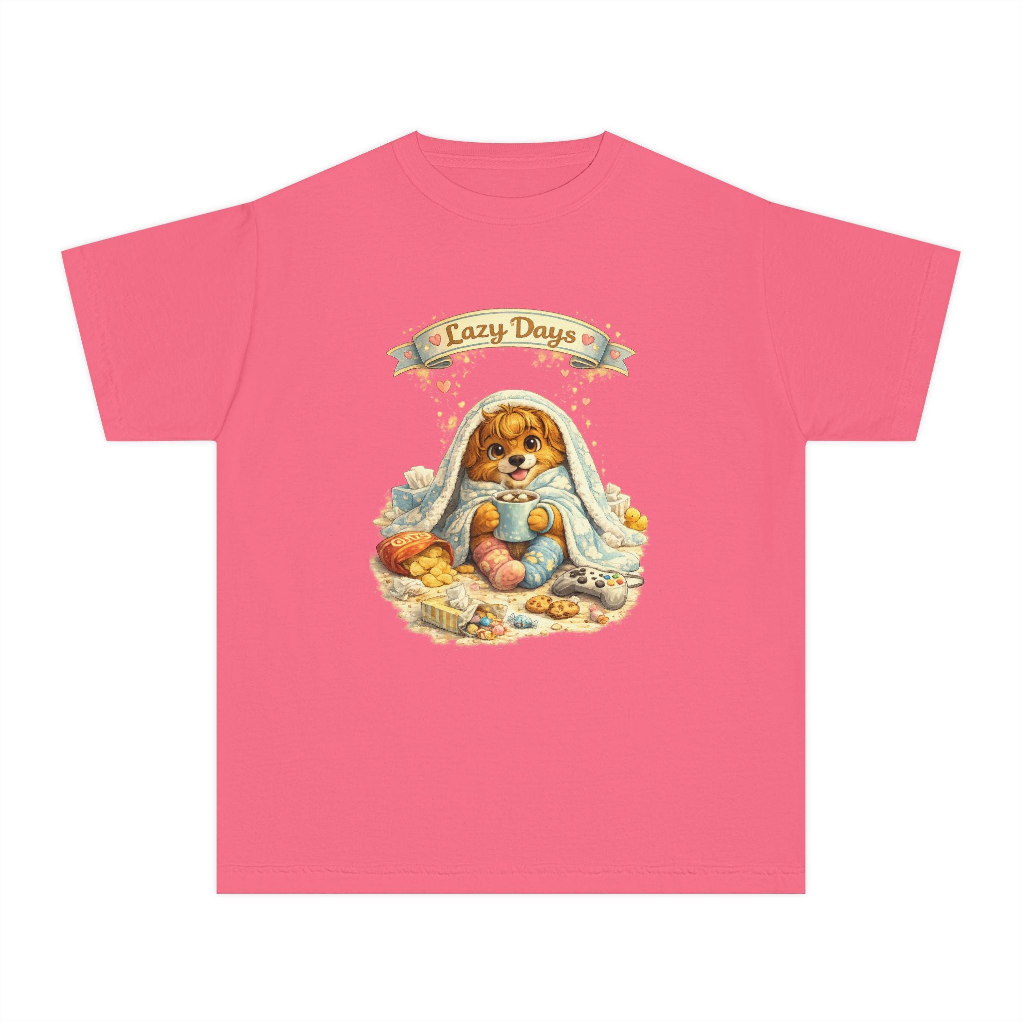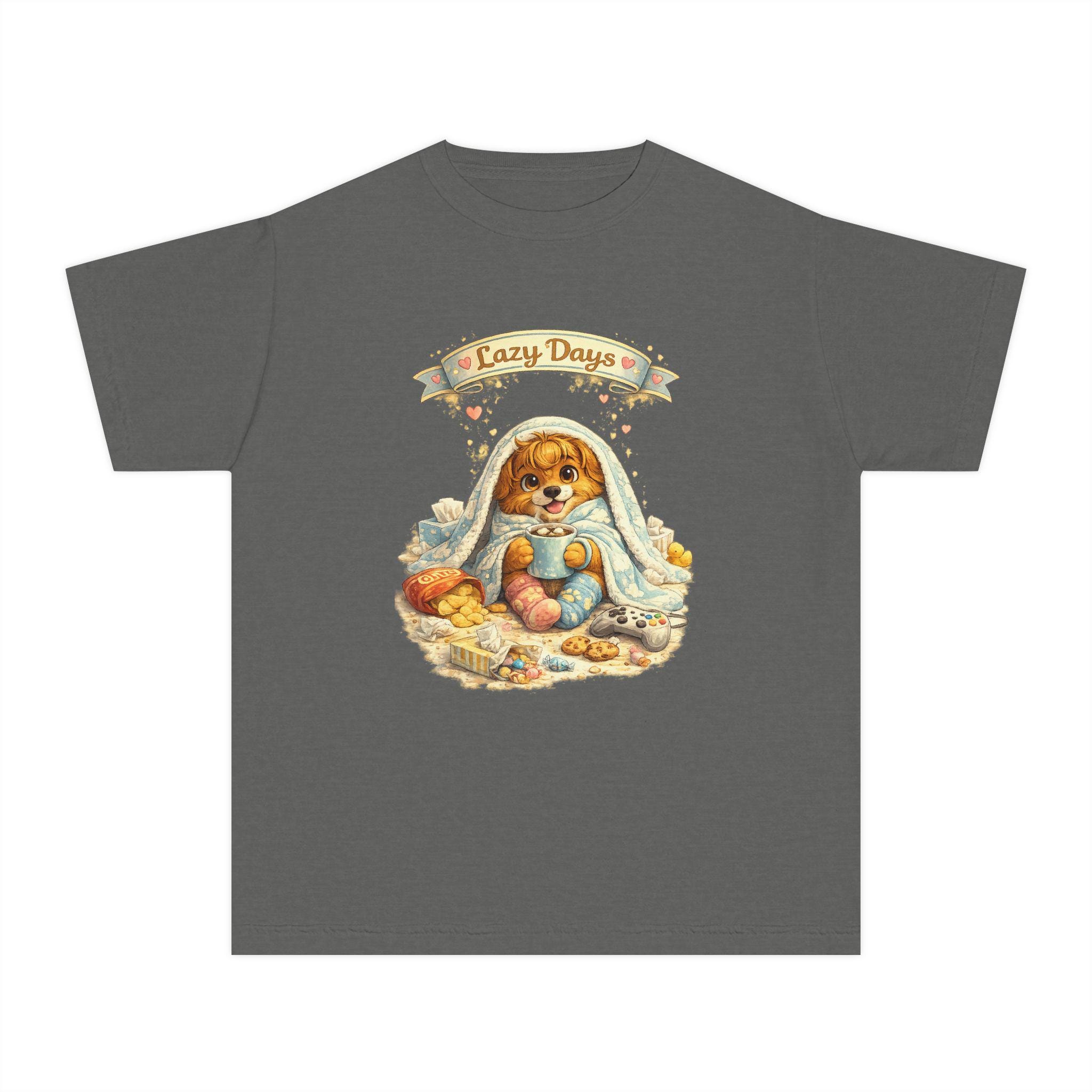 Soft, sunny, and utterly cozy — this youth midweight tee brings a slow-morning vibe to little wardrobes. A gently garment-dyed cotton body carries a warm cream-yellow wash that feels lived-in from day one. The center artwork shows an adorably sleepy puppy tucked under a blanket with plush toys scattered around, and a banner above reading “Lazy Days.” Short, simple sentences capture a relaxed afternoon: cartoons on in the background, a cup of cocoa within reach, and a kiddo drifting between play and nap. The classic fit and medium-weight, combed ring-spun cotton make it comfortable for playtime, quiet story hours, and everything in between. Durable double-needle stitching and twill tape at the neck keep the tee soft but ready for repeat wears and washes — the kind of shirt that becomes a favorite by habit, not hype.