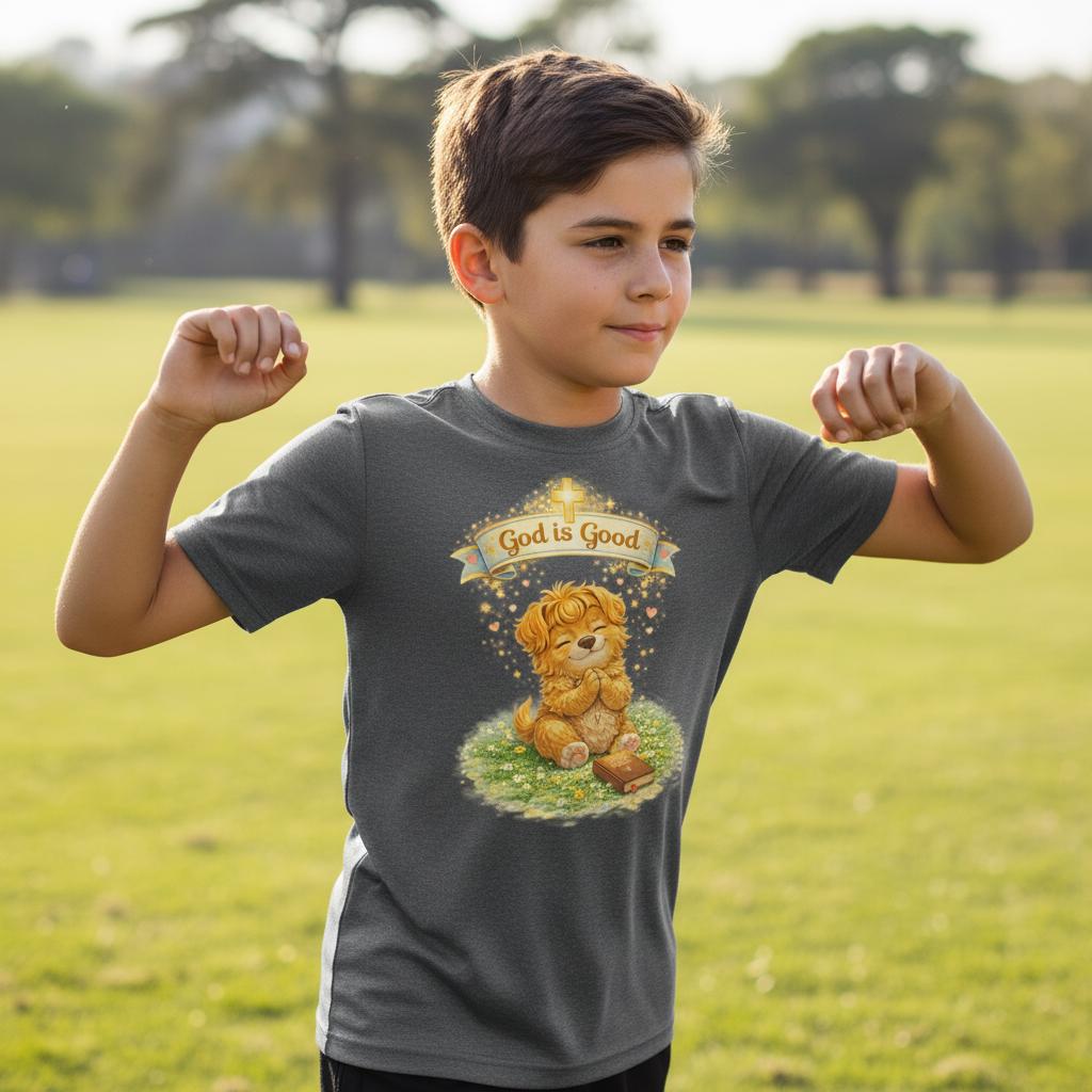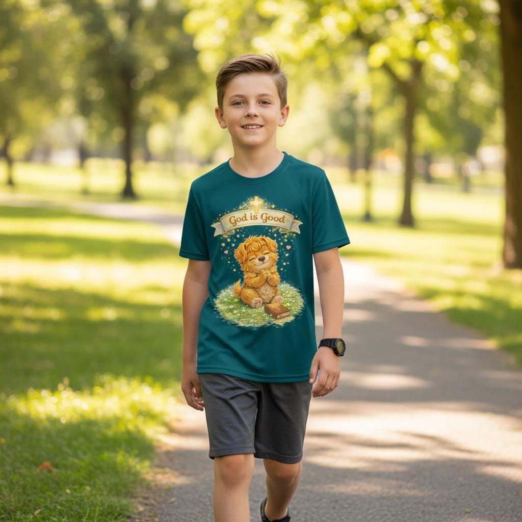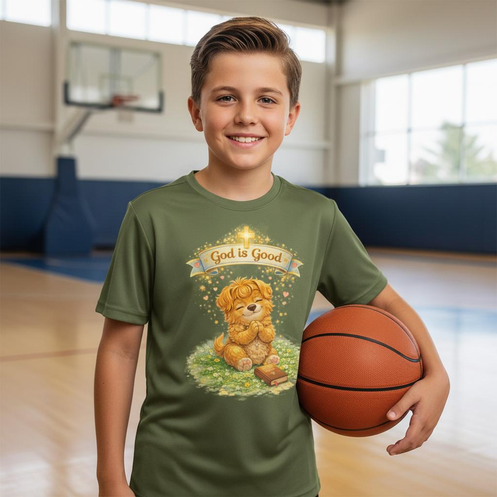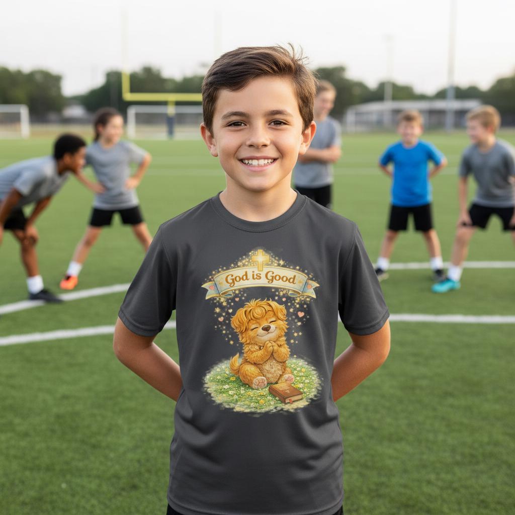 Lightweight and gentle against the skin, this youth athletic tee brings a quiet, tender message into everyday play. A soft, golden illustration of a small lion cub sits beneath a warm banner that reads “God is Good,” surrounded by sunlit grass and subtle heart accents. The extra-light, moisture-wicking polyester keeps active kids cool during practices, playground runs, and summer outings, while the athletic cut offers comfortable movement. The DTF print captures delicate watercolor tones and fine detail, holding color and clarity through many washes. Tear-away label ensures itch-free wear. This tee fits into calm mornings, church outings, and cozy family moments where faith and comfort meet.