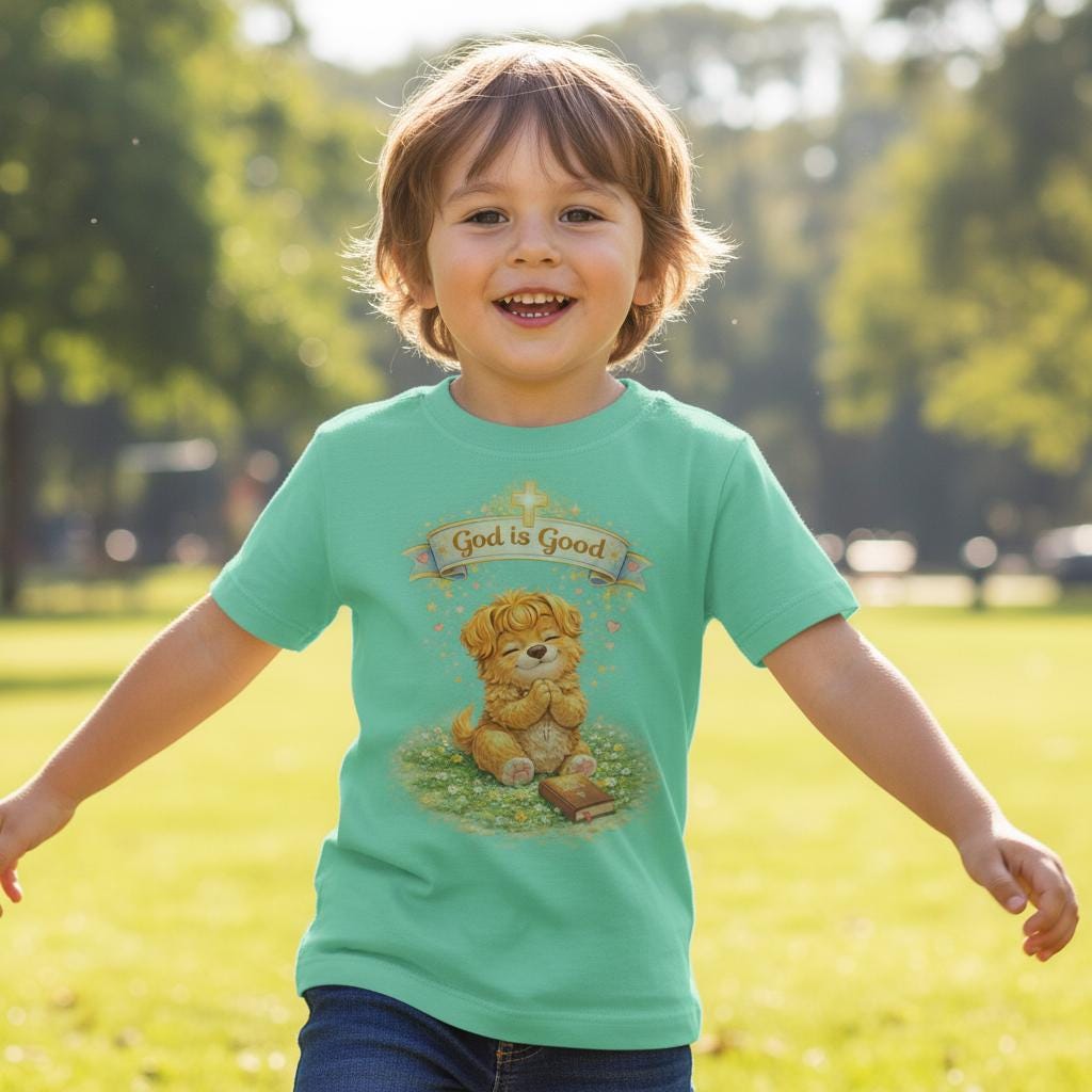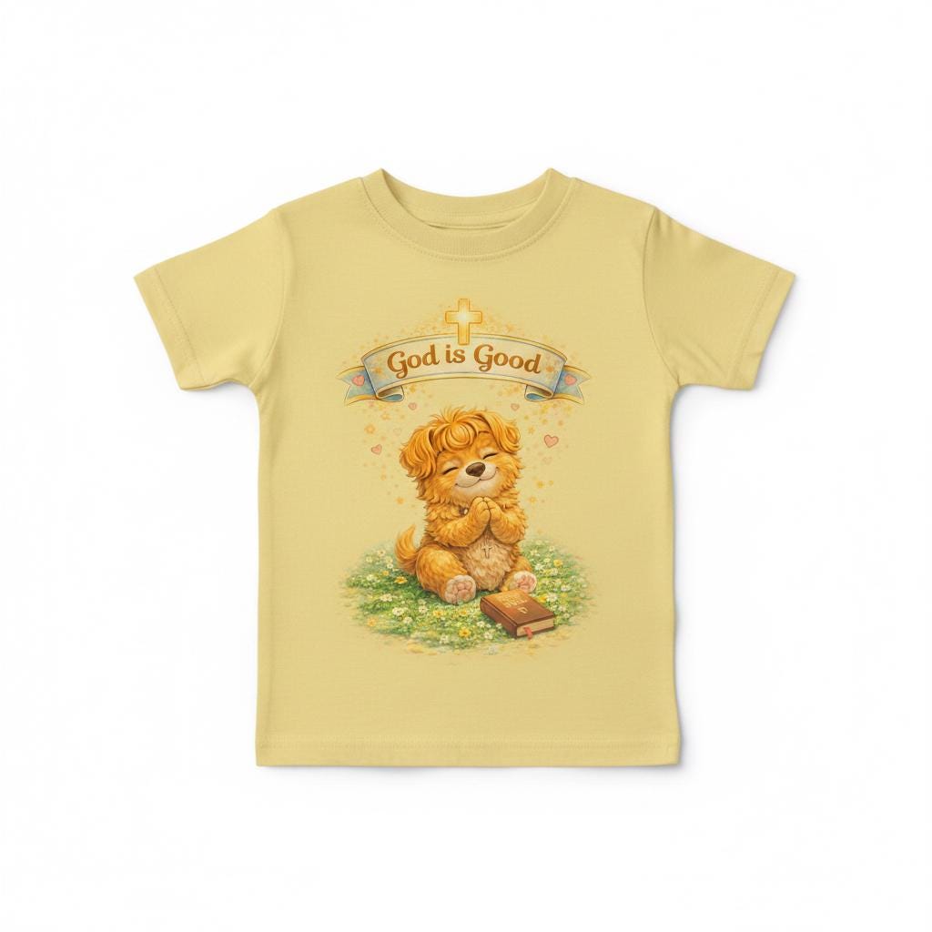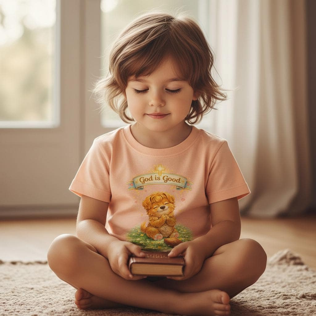 This soft infant tee brings gentle warmth to little moments. A golden, vintage-style bear sits on a patch of grass beneath a tiny banner that reads “God is Good,” giving the shirt a cozy, hopeful feeling without being loud. The lightweight cotton fabric breathes on warm days and layers easily under sweaters when it’s cooler. Short sleeves and a classic cut let babies move freely—reaching, crawling, napping—while the ribbed neckline and shoulder tape keep the shape steady through washes. It’s a quiet piece for church mornings, family photos, baby dedications, or everyday cuddles.